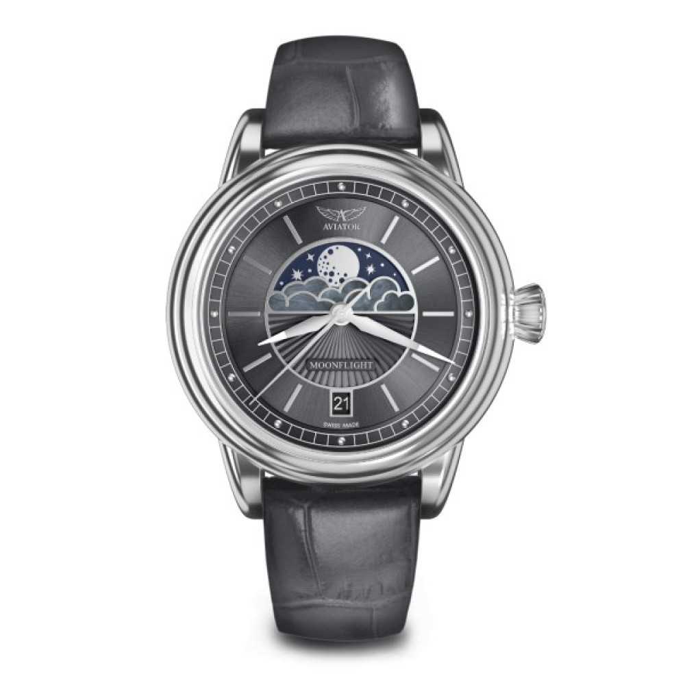 Циферблат є найвищим досягненням стилю та філософії ар-деко. Текстура у вигляді сонячних променів, металеві мітки відполіровані за допомогою алмазу і справжній перламутр надають м'якість і загадковість чіткому і рішучому дизайну. Особливу увагу привертає найпомітніший елемент циферблату – диск із фазами Місяця, обрамлений хмарами та гільошованими візерунками, а також тривимірні елементи, що зникають за горизонтом. Виділяються нанесені на хвилинній шкалі "заклепки", що відсилають до літаків "золотого століття" авіації. Якщо придивитися до Місяця, все найцікавіше – у деталях. Оброблені справжнім перламутром хмари служать апертурою для показників місячних фаз і відсилають нашу уяву до строгої класики модних у 1930-ті роки намисто, додаючи принадність старовини цієї позачасової моделі. Переливи та відображення на перламутровій поверхні нагадують місячне світло. Подивіться, як він грає, відбиваючись на хмарах та всипаному зірками небі. Кожна з восьми фаз Місяця впливає на режим сну, стан умів, провокує припливи та відливи. З годинником AVIATOR MoonFlight на зап'ясті ви зможете відстежувати зміну місячних фаз протягом всього місячного циклу (він триває 29,5 діб) і щохвилини спостерігати, як вони позначаються на вашому стані.