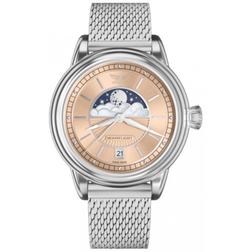 У колекції годинника AVIATOR MoonFlight класичні елементи стилю ар-деко ефектно поєднуються з фазами Місяця. моделі, що ввійшли до неї, присвячені кращому літаку тих часів. З ними ви будете оточені зірками у вишуканій атмосфері від-кутюр.