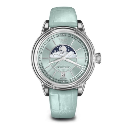 З настанням «золотого століття» авіації властиві мандрівкам того часу вишуканість і розкіш досягли нових висот. До проектування літаків підключилися провідні кутюр'є, ідеї яких знаходили відображення у всьому, від форми фюзеляжу до форменого одягу екіпажу. Особливо комфортними були нічні рейси на борту літака Douglas DC-3, під час яких пасажири могли від заходу сонця до світанку милуватися Місяцем. Розкіш і містика Місяця лягли в основу витончених годинників AVIATOR MoonFlight. Урожайна кольорова гама, відполіровані чіткі лінії та гільошовані візерунки типу «сонячні промені» – всі ці елементи відсилають нас до 1930-х років. Хмари виконані з чудового перламутру, поєднуючи красу простих форм з модними тенденціями, а місячний диск і нічне небо постають у всій своїй красі.