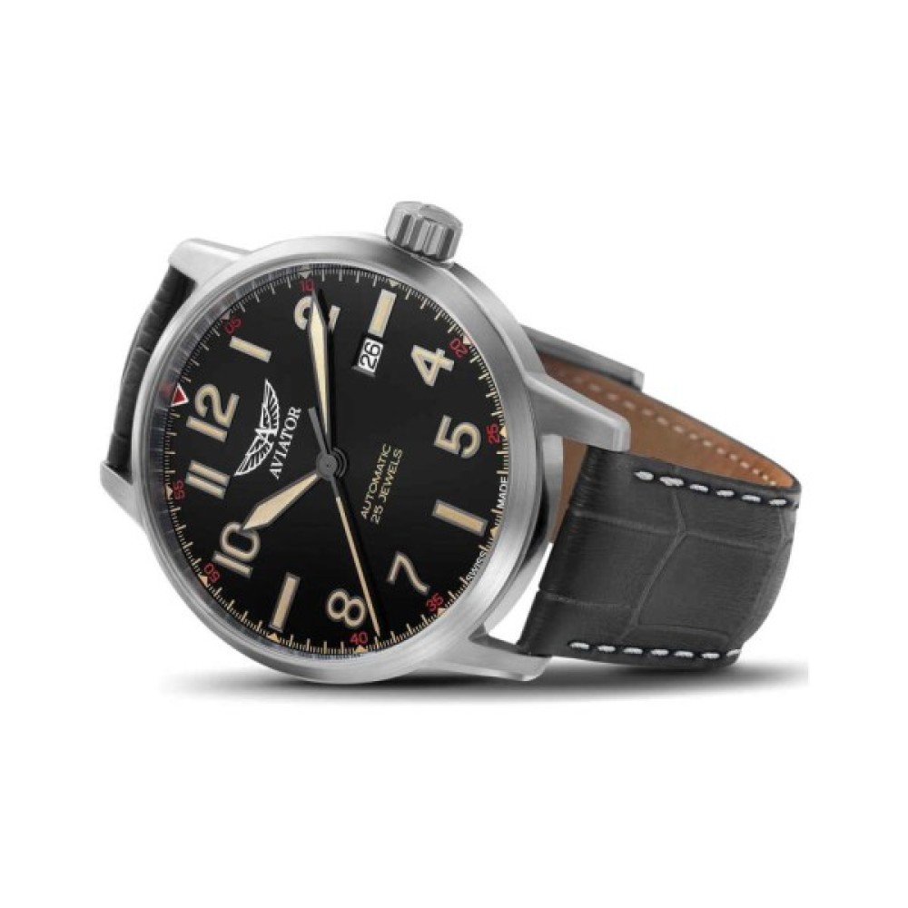 Матований корпус AVIATOR Airacobra Auto з діаметром 45 міліметрів витриманий у строгому класичному стилі і має правильні пропорції. Своїм оформленням цей годинник повертає нас у давно минулу епоху. Випрямлені лапки корпусу акцентують вигнуті лінії корпусу і надають годинникам вигляду ретро. Крім того, масивна головка настільки зручна у використанні, що переводити час можна навіть у рукавичках пілота зразка 1940-х років.