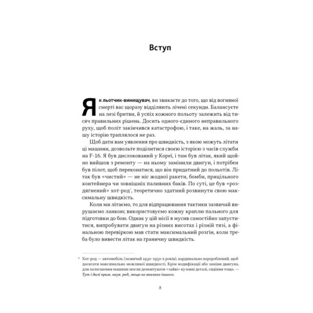 У цій книжці пілот F-16 і F-35 ділиться бойовим досвідом, вчить гартувати власну стійкість в екстремальних умовах, розповідає про три степеневі закони, розкриває принципи успішності операцій — від якісного оцінювання до аналізу проведених дій.
