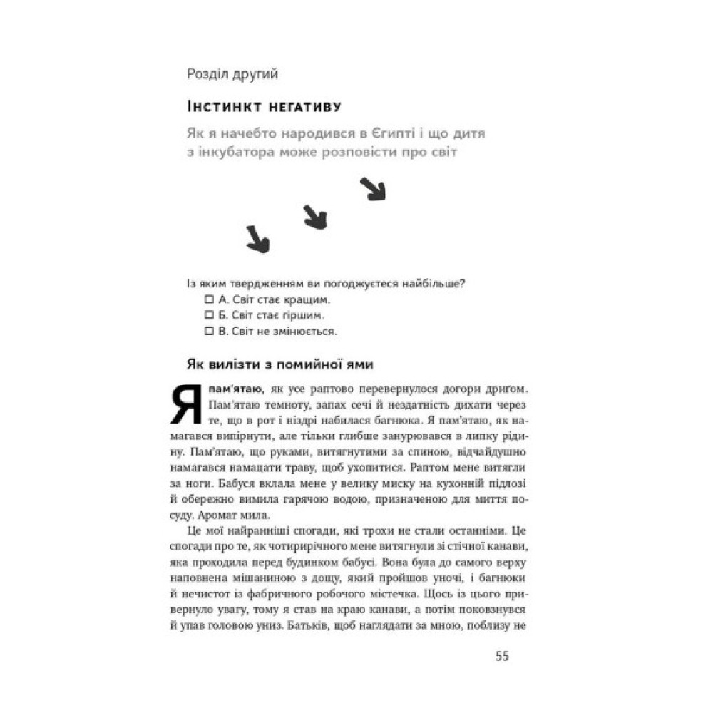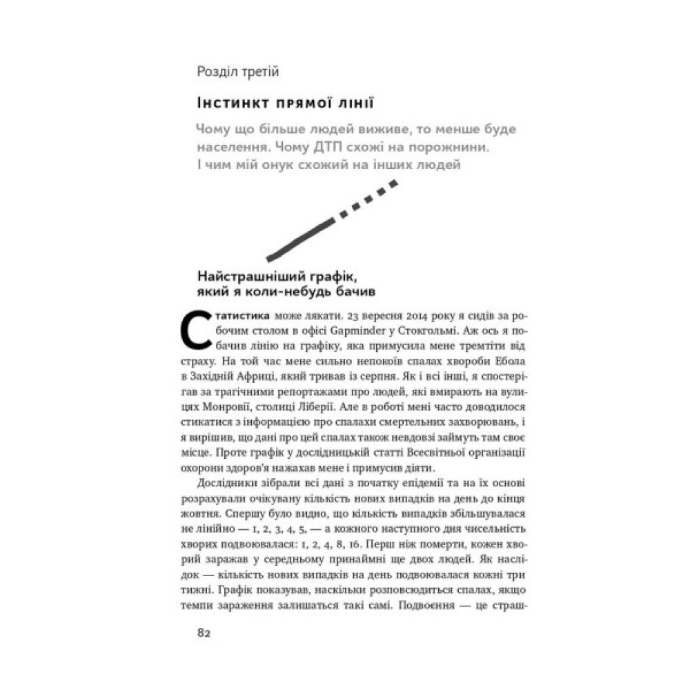 Ми схильні драматизувати життя навколо нас. Яка частка людей у світі живе в злиднях? Скільки сучасних дітей вакциновано? Скільки років навчаються дівчата з бідних країн? Інформація про ці факти постійно циркулює навколо нас, але навіть високоосвічені люди відповідають на них неправильно. Викладачі університетів, журналісти, експерти, директори мультинаціональних компаній, нобелівські лауреати часто показують слабкі результати. Навіть шимпанзе, які обирали б відповіді випадково, справляються краще. Ба більше, помилки тяжіють до одного напрямку - світ страшніший, жорстокіший і безнадійніший, ніж є насправді. Очевидно, причина не в поінформованості чи інтелекті. Усе це - ірраціональне мислення й драматичні інстинкти, що примушують людей згущувати фарби.