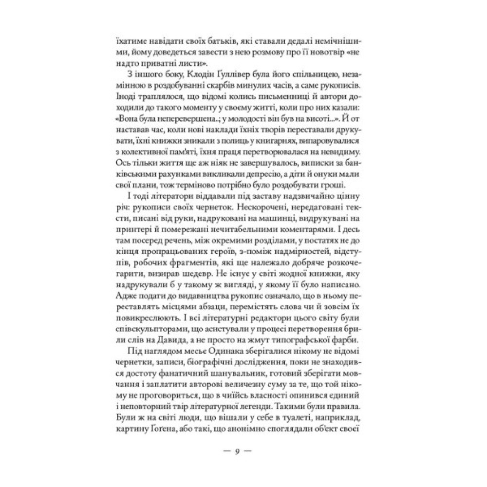 Ця книжка не тільки про Одинака, його рідних і друзів. Вона і про те, щоб читати самих себе, шукати людей, з якими почуваєшся «повним виданням», а не «вибраним». І, звісно, переміщуватися від плану до імпровізації, накривати в серці один стіл для бажань та розуму і знаходити в читанні цілковиту свободу.