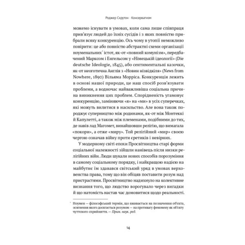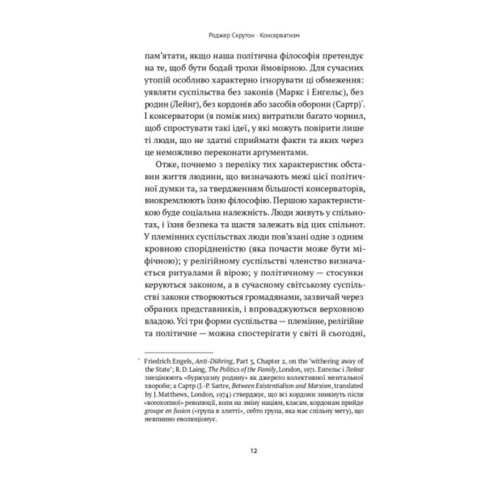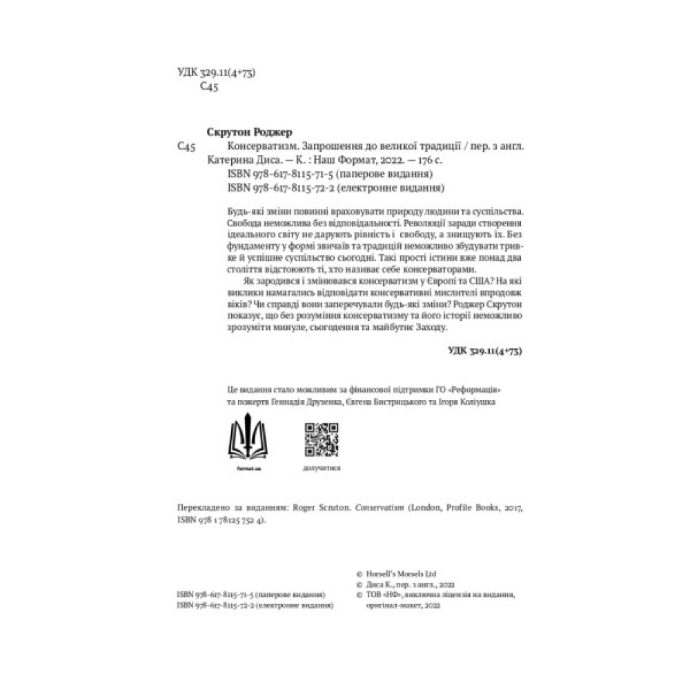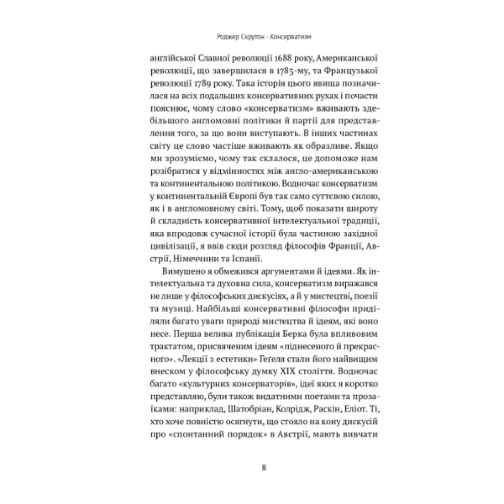 Чи справді «консерватизм» — відсталість, символ небажання щось змінювати? Чи справді консерватори — ті, хто виступав проти свободи? На ці питання аргументовано відповідає Роджер Скрутон. Він показує консерватизм з іншого боку — через праці Гассета і Гаєка, вірші Еліота й Рільке, музику Гофмансталя та Штрауса. Це не заперечення прогресу, а те що зробило Захід вільним та успішним.