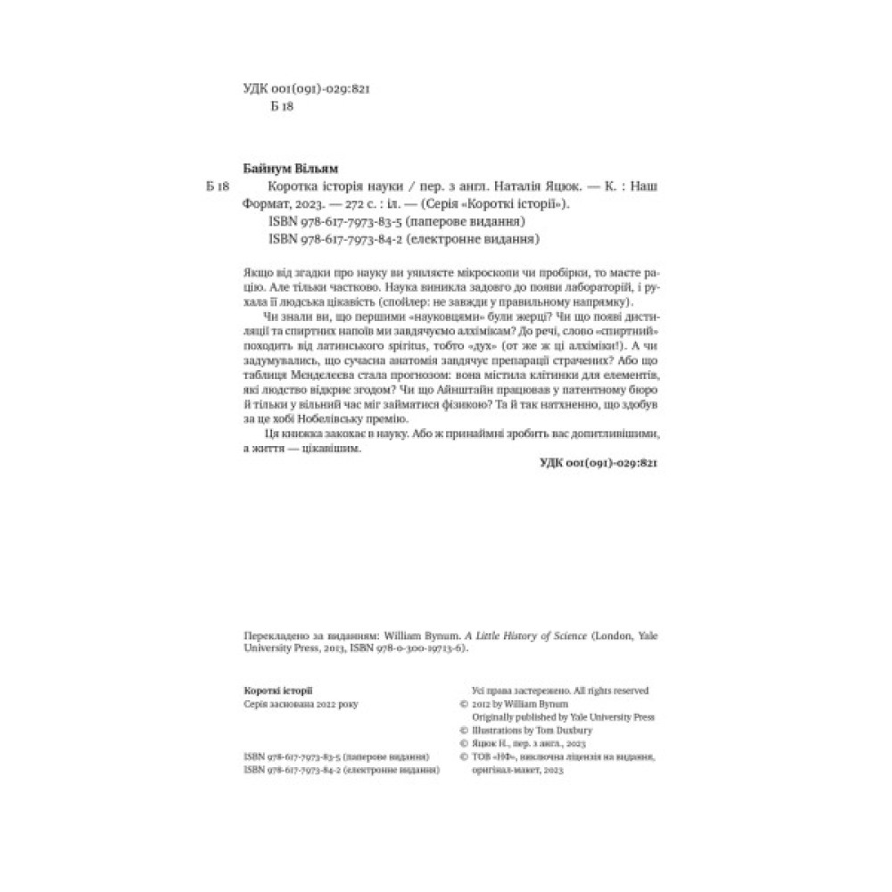 Якщо від згадки про науку ви уявляєте мікроскопи чи пробірки, то маєте рацію. Але тільки частково. Наука виникла задовго до появи лабораторій, і рухала її людська цікавість (спойлер: не завжди у правильному напрямку). Чи знали ви, що першими «науковцями» були жерці? Чи що появі дистиляції і спиртних напоїв ми завдячуємо алхімікам? Або що таблиця Менделєєва стала прогнозом: вона містила клітинки для елементів, які людство відкриє згодом? Чи що Айнштайн працював у патентному бюро й тільки у вільний час захоплювався фізикою? Та й так натхненно, що здобув за це хобі Нобелівську премію. Це лише частина запитань, на які відповідає професор Вільям Байнум.