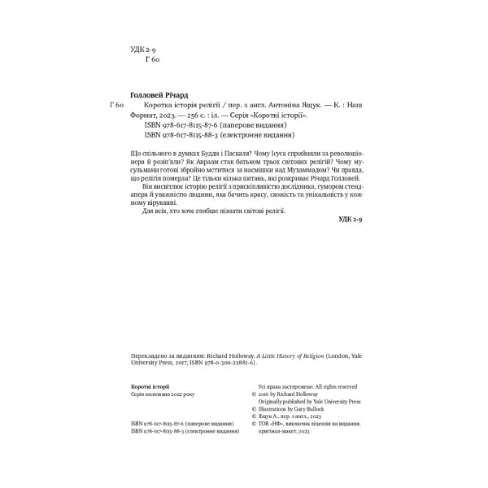 Що спільного в думках Будди та Паскаля? Чому Ісуса сприйняли за революціонера і розіп’яли? Чому мусульмани готові збройно мститися за насмішки над Мухаммадом? Чи правда, що релігія померла? Це тільки кілька питань, які розкриває Річард Голловей. Він висвітлює історію релігії з прискіпливістю дослідника, гумором стендапера й уважністю людини, яка бачить красу, схожість та унікальність у кожному віруванні. Щоб розгледіти спільне й відмінне в індуїзмі, буддизмі й джайнізмі, вам не доведеться читати священні тексти. Щоб розуміти віхи християнства, не обов’язково читати Новий Завіт й історію церковних розколів. Достатньо цієї книжки, де все найважливіше й найцікавіше зібрано під однією палітуркою.