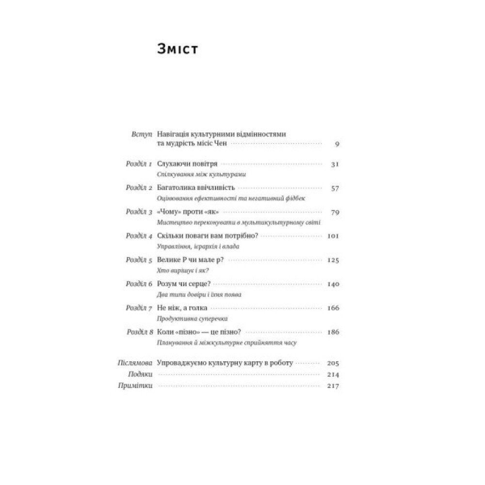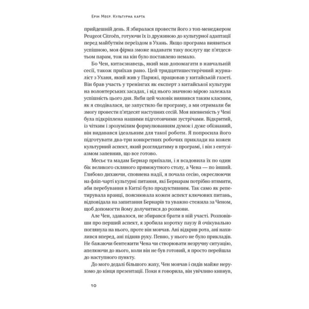 Про це розповідає консультантка з міжнародної співпраці Ерін Меєр. На реальних історіях вона демонструє, як взаємодіють представники різних культур, аналізує типові помилки, вчить дивитися на ситуацію очима підлеглих чи керівників, що зростали в іншій культурі. Також авторка пропонує дієвий інструмент: восьмишкальну модель, завдяки якій ефективність міжнародної команди зросте в рази.