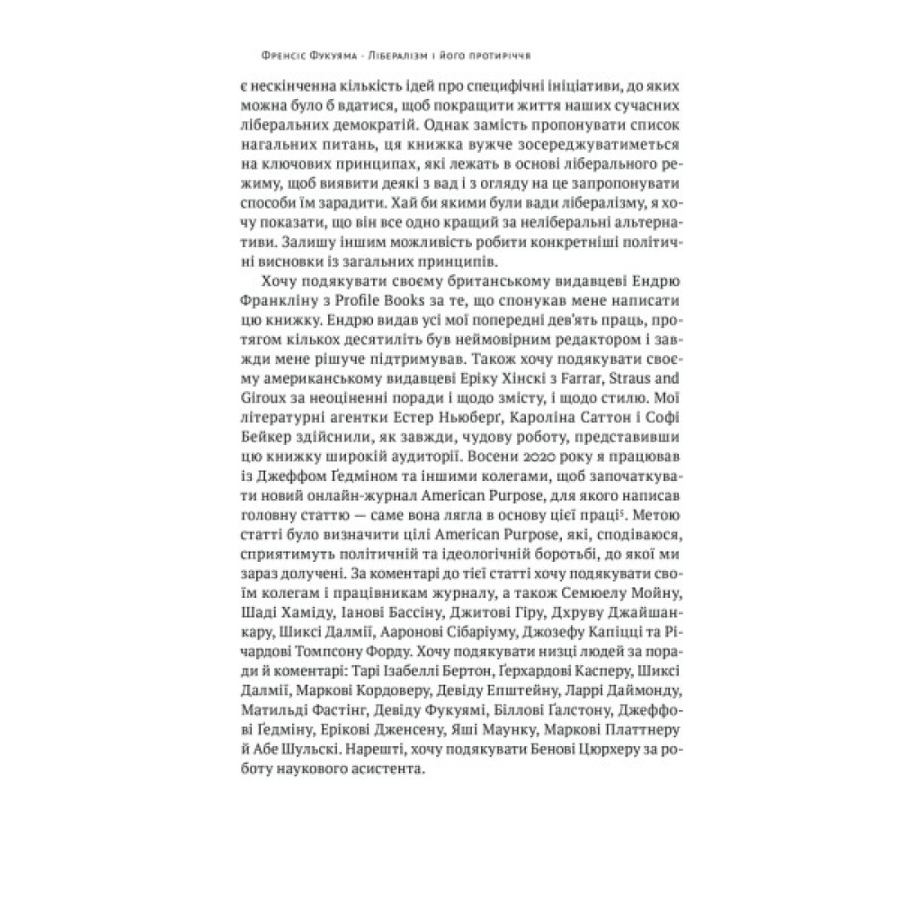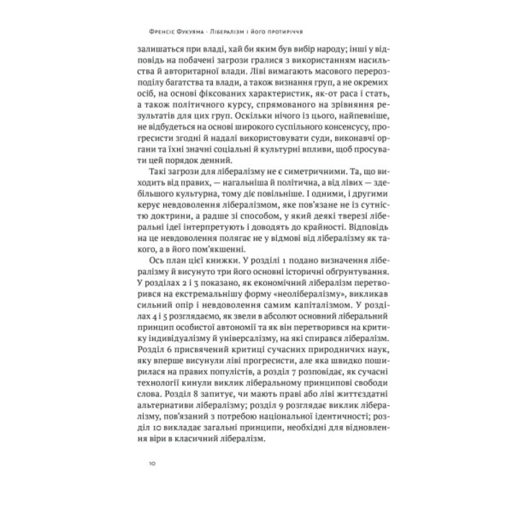 У книжці подано результати ґрунтовного дослідження різних форм нерівності та ідентичностей, джерел фінансових криз, деградації еліт, технологій маніпулювання населенням, порівняння лібералізму з ідеологіями в сучасних автократіях. Ця книжка корисна для розуміння політичної, економічної та соціокультурної мап світу, переваг і вразливостей популярних нині суспільно-політичних теорій, а також підводних каменів, які трапляються на шляхах демократичних країн.