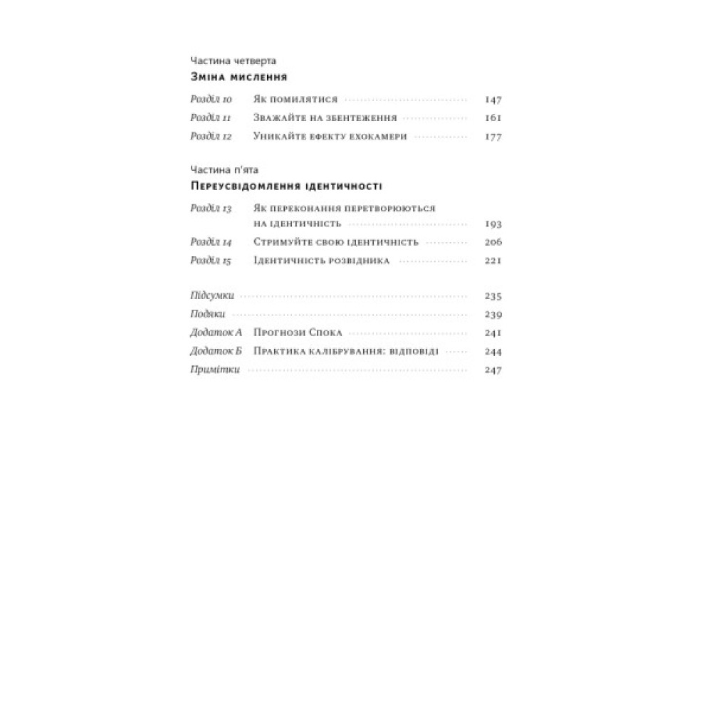 Авторка послідовно пояснює, як зробити власну карту мислення точнішою, прибрати фільтр упередженості й почати міркувати ясніше. Джулія Ґалеф пише захопливо, із цікавими історіями й переконливими аргументами навіть у таких «заряджених» темах, як зміна клімату, переривання вагітності чи регулювання обігу зброї.