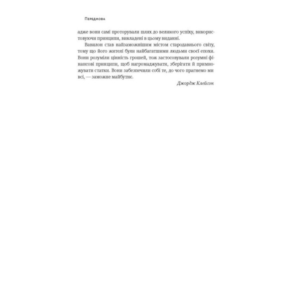 Клейсон надає важливе значення силі волі та відданості меті. Він закликає намагатися заощаджувати за будь-яких умов, контролювати витрати та інвестувати в себе, щоб вдосконалити вміння заробляти. Кожна притча завершується висновком, що спонукає до роздумів. А відсилання до епохи Вавилона натякає, що ази фінансової грамотності незмінні тисячоліттями та що в будь-які часи все може стати краще за наявності бажання, стійкості й рішучості. Ця книга може бути відправною точкою для вивчення основних компонентів особистих фінансів, таких як заощадження та інвестиції, або ж нагадуванням про принципи економії й здорові стосунки з грошима, якщо ви вже знайомі з базою.