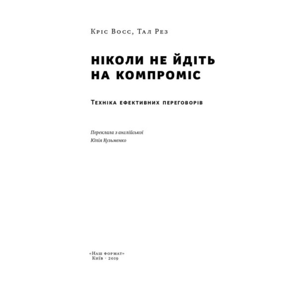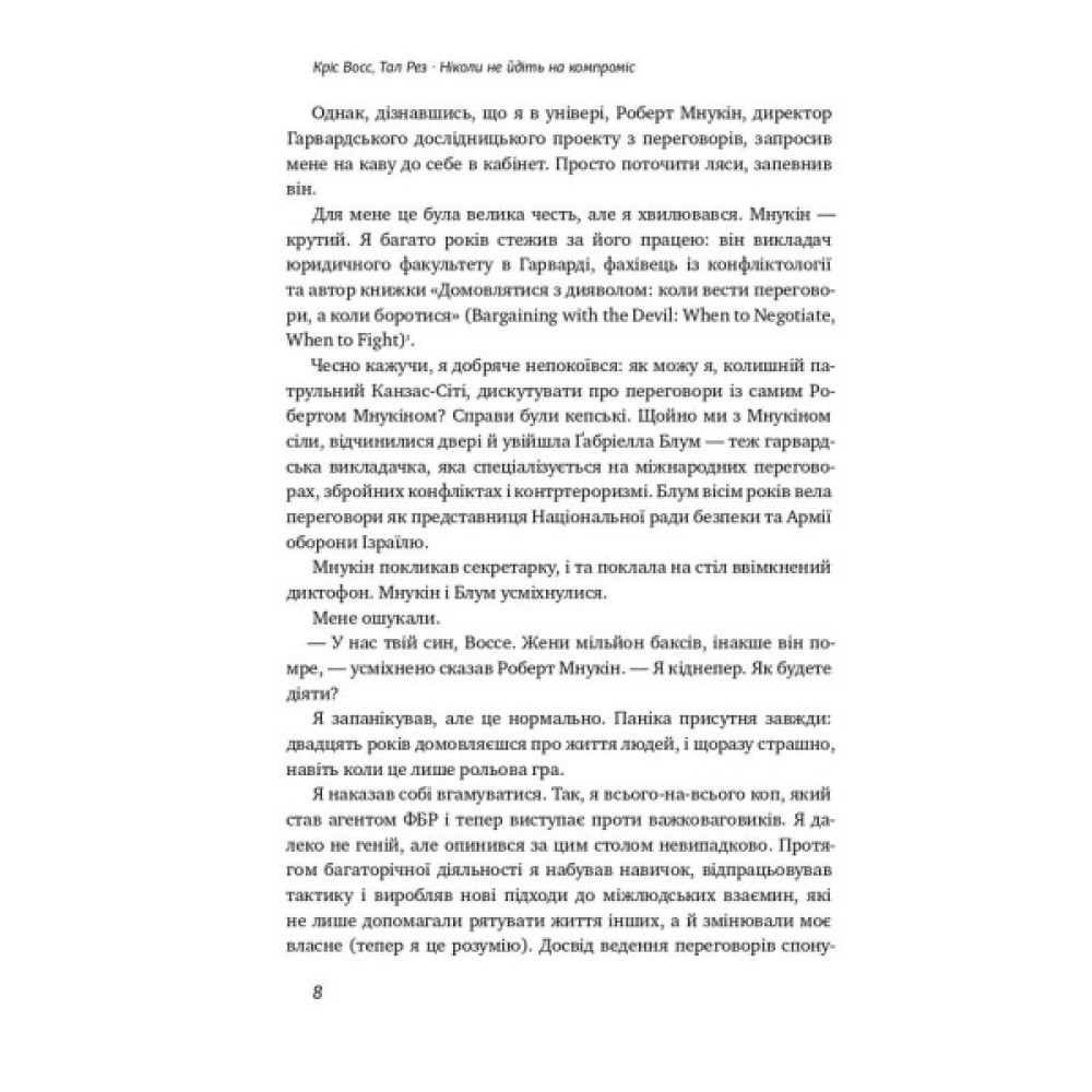 Кріс Восс понад 20 років працював переговорником ФБР зі звільнення заручників та вів надскладні перемовини з немислимо високими ставками. Після завершення кар’єри він зрозумів, що прийоми, які напрацювали він і колеги, можуть так само ефективно застосовуватися в будь-якій сфері та будь-яких стосунках.
