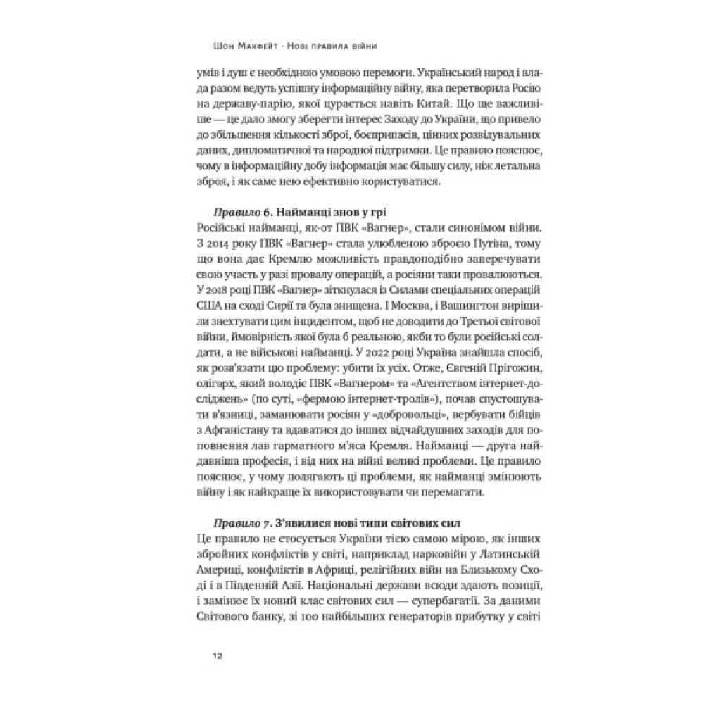 Наш світ на порозі тривалого військового й геополітичного хаосу. Росія, Китай та Іран цілеспрямовано руйнують світовий порядок, порушуючи всі традиційні правила війни з часів Вестфальського миру. В хід ідуть приватні військові компанії, армії без розпізнавальних знаків, маріонеткові проксі-сили на зразок терористичних, кримінальних чи революційних угруповань. Скринька Пандори вже відкрита, переконаний Шон Макфейт, і поствестфальська неконвенційна війна пануватиме у ХХІ столітті. Переможе той, хто швидше опанує її методи.