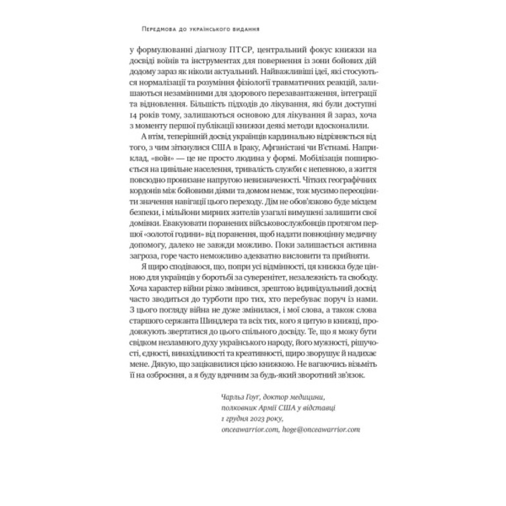 Автором книги є Чарльз Гоуґ, полковник армії США у відставці та провідний експерт з питань впливу війни на психічне здоров’я. Він здобув докторський ступінь у Школі медицини Університету Меріленду та пройшов там ординатуру. Також він підвищував кваліфікацію у Балтиморській міській лікарні імені Джона Гопкінса та Армійському медичному центрі Волтера Ріда. Крім письменництва, Гоуґ також займається дослідницькою роботою, консультаціями та публічними виступами з питань покращення догляду за воїнами.