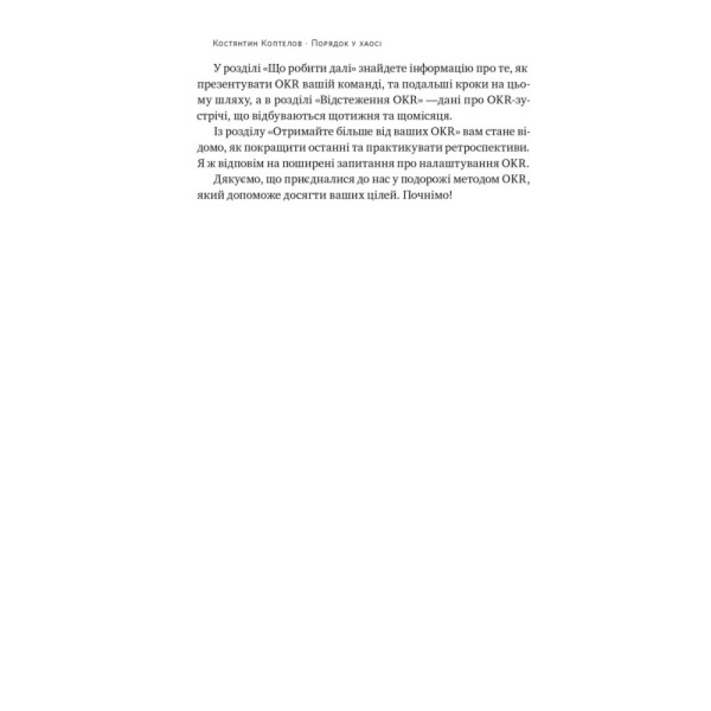 У цій книжці автор крок за кроком пояснює, якими є переваги цілепокладання, які нові підходи до планування застосовують у сучасному світі, а також розповідає про основні принципи, структуру й інструменти OKR. Особливу увагу приділено до впровадження методу на практиці й опису типових помилок. Метод OKR дасть підприємцям змогу зосередитися на найважливішому й отримати більше за менший проміжок часу.