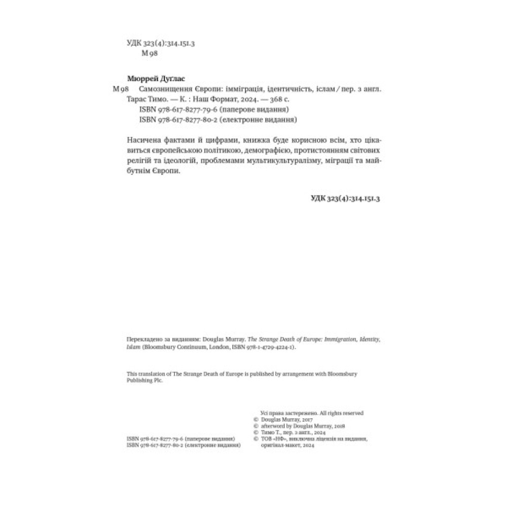 Бурхливі дискусії, критика з боку «ліберальних» ЗМІ, звинувачення в ісламофобії та статус міжнародного бестселера — саме такий резонанс викликала книжка провідного британського інтелектуала Дуґласа Мюррея. Сьогодні тези автора стають дедалі переконливішими, а прогнози вражають точністю.