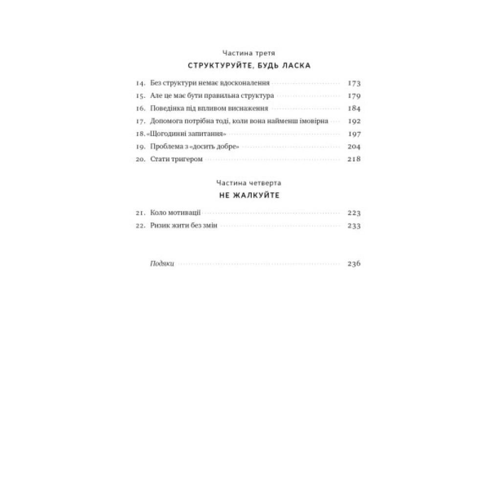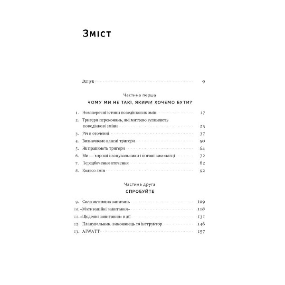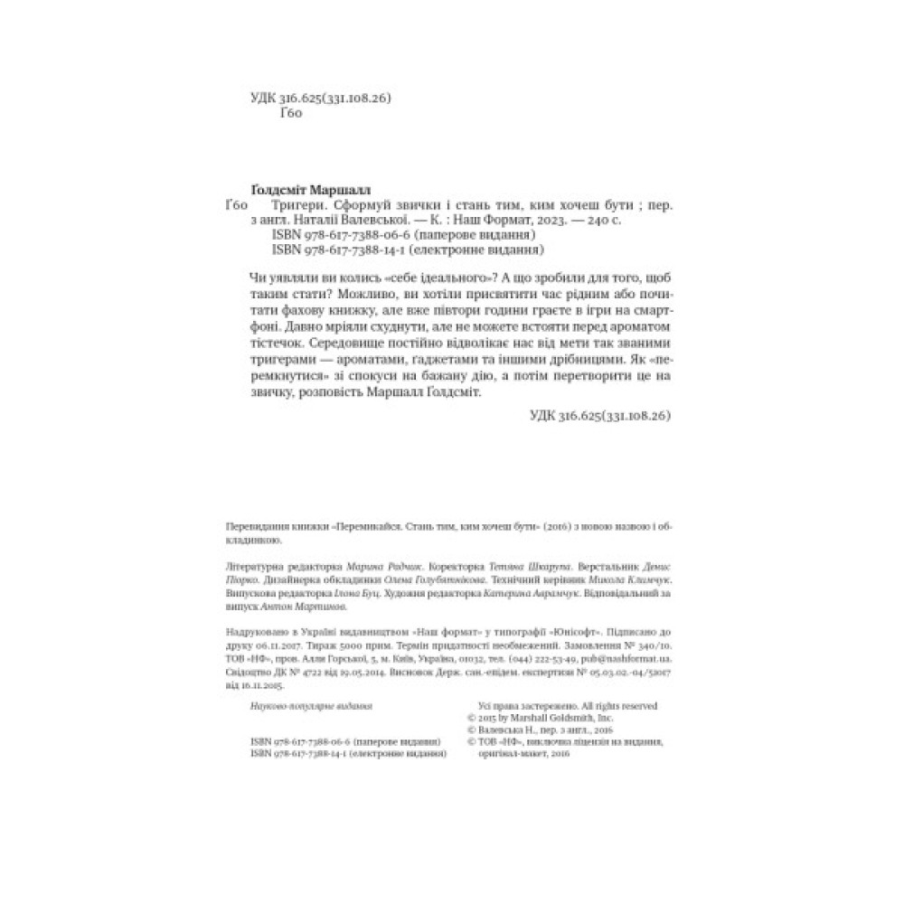 Чи уявляли ви колись «себе ідеальних»? А що зробили для того, щоб такими стати? Можливо, ви хотіли присвятити час рідним або почитати фахову книжку, але вже півтори години граєте в ігри на смартфоні. Давно мріяли схуднути, але не можете встояти перед ароматом тістечок. Середовище постійно відвертає нас від мети так званими тригерами — ароматами, ґаджетами й іншими дрібницями. Як перемкнутися зі спокуси на бажану дію, а потім перетворити це на звичку, розповість Маршалл Ґолдсміт.