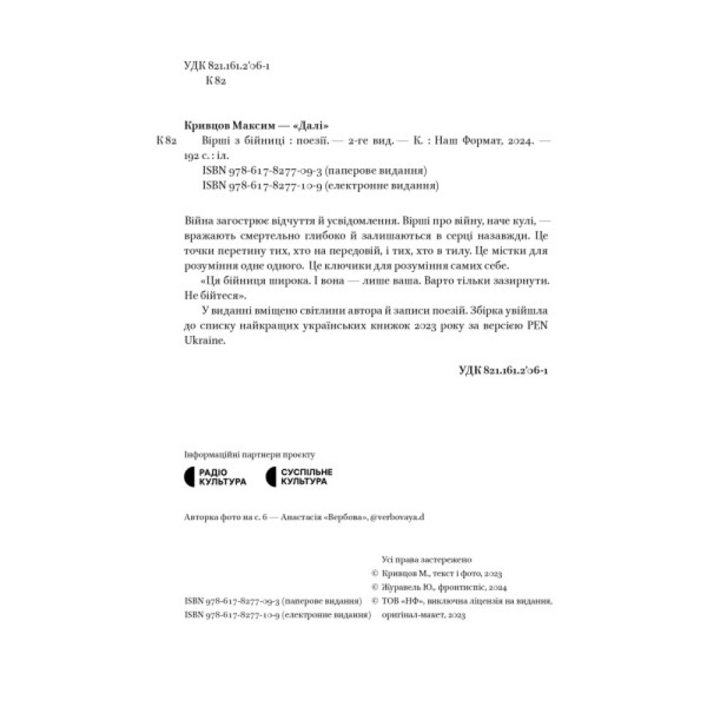 Прочитайте ці вірші. Побудьте поруч. Зіпріться на обвалену стіну. Подихайте сирістю й порохом. Послухайте, як співають птахи на початку весни і працює ворожа техніка на дванадцяту годину. А тоді підійдіть до бійниці — й дивіться.