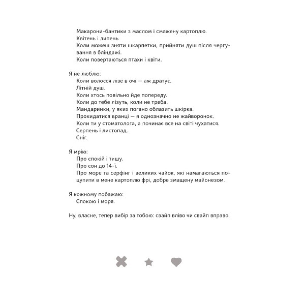 Покажіть собі себе. Те, скільки цукру ви кидаєте собі в чай. Як смажите картоплю. Як жмуритесь від сонця. Як високо закачуєте шкарпетки. Чи зіжмакуєте паперовий стаканчик перед тим, як кинути його до смітника. Ця бійниця широка. І вона — лише ваша. Варто тільки зазирнути.