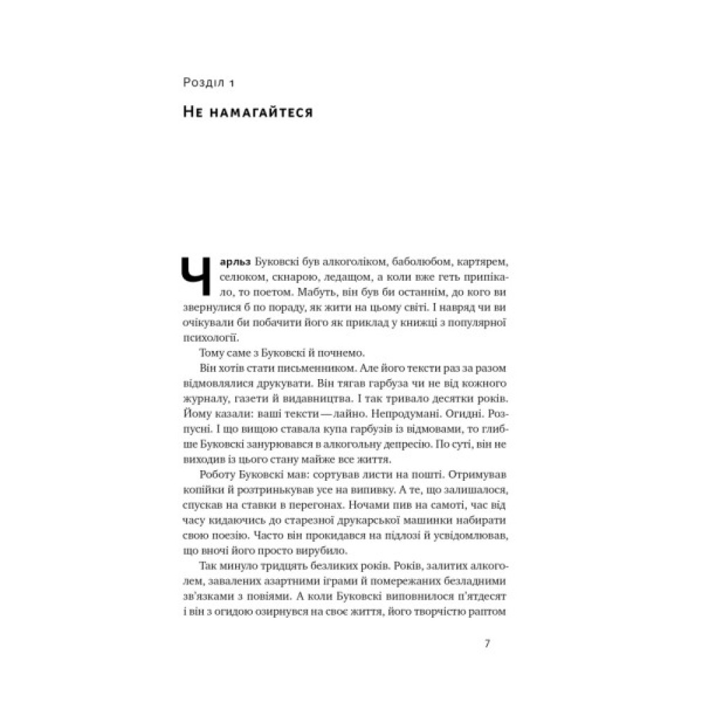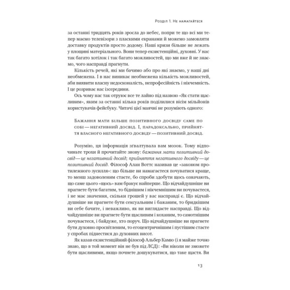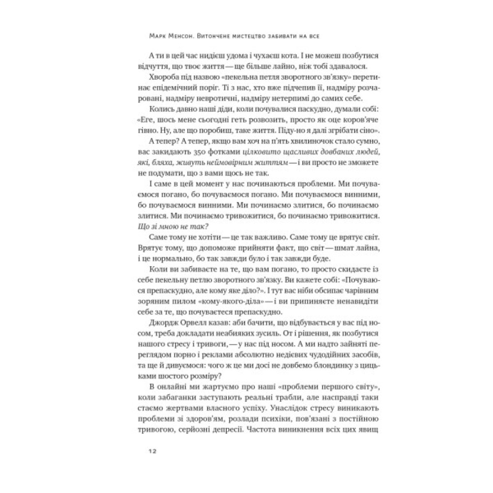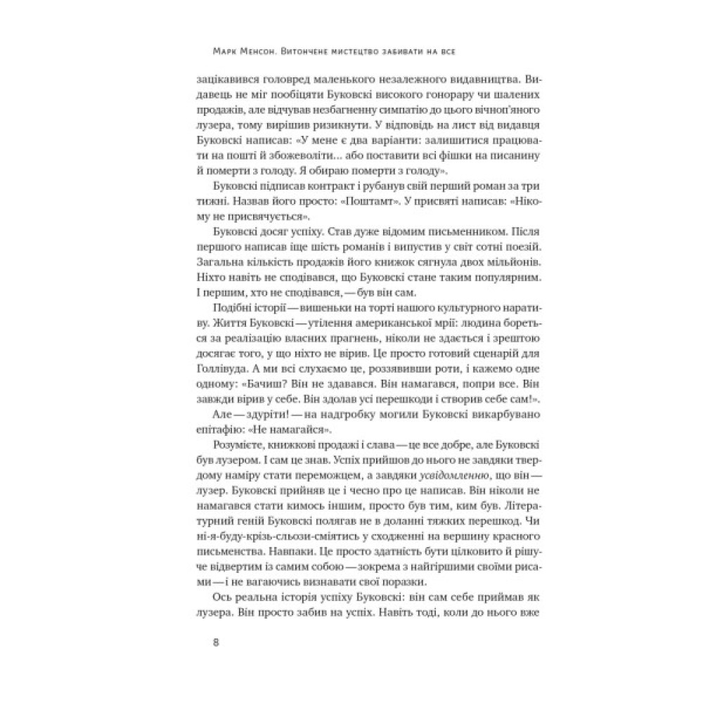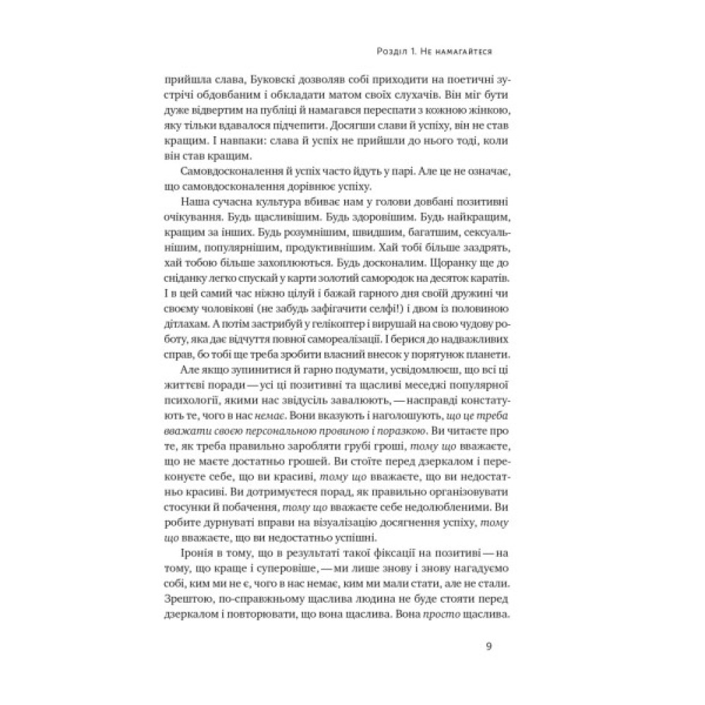 Про мистецтво забивати на всеНаша сучасна культура вбиває нам у голови довбані позитивні очікування. Будь щасливішим. Будь здоровішим. Будь наикращим, кращим за інших. Будь розумнішим, швидшим, багатшим, сексуальнішим, популярнішим, продуктивнішим. Хай тобі більше заздрять, хай тобою більше захоплюються. Будь досконалим... Але якщо зупинитися й гарно подумати, усвідомлюєш, що всі ці життєві поради — усі ці позитивні та щасливі меседжі популярноі психологіі, якими нас звідусіль завалюють, — насправді констатують те, чого в нас немає.