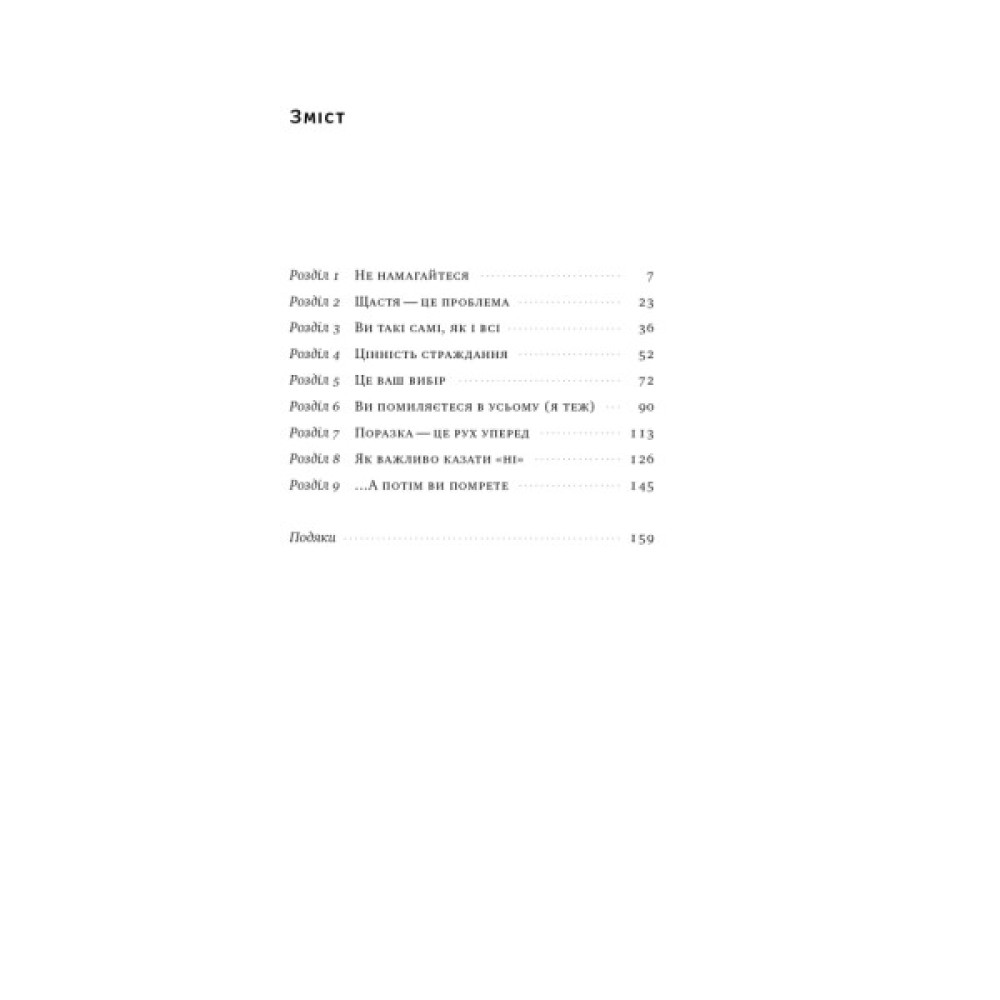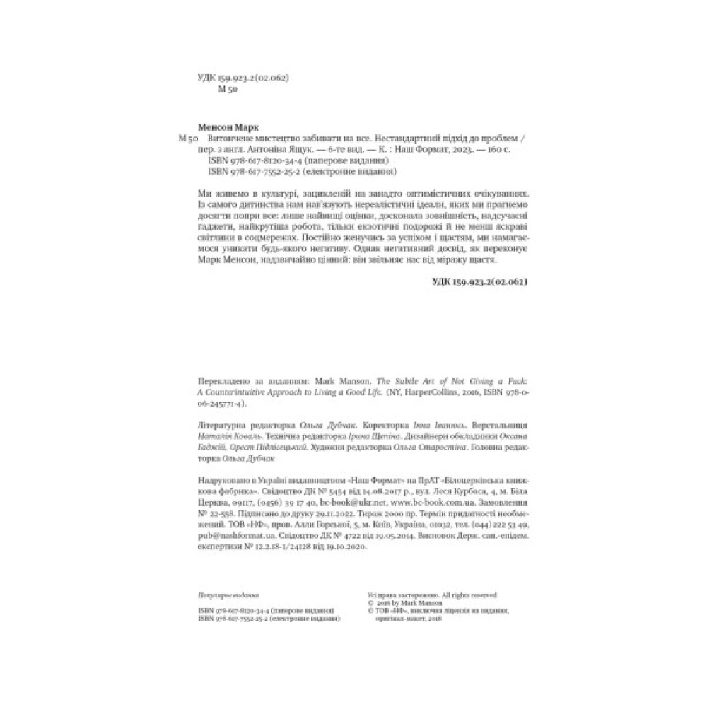 Про книжкуМи живемо в культурі, зацикленій на занадто оптимістичних очікуваннях. Із самого дитинства нам нав’язують нереалістичні ідеали, яких ми прагнемо досягти попри все: лише найвищі оцінки, досконала зовнішність, надсучасні ґаджети, найкрутіша робота, тільки екзотичні подорожі й не менш яскраві світлини в соцмережах. Постійно женучись за успіхом і щастям, ми намагаємося уникати будь-якого негативу. Однак негативний досвід, як переконує Марк Менсон, надзвичайно цінний: він звільняє нас від міражу щастя.