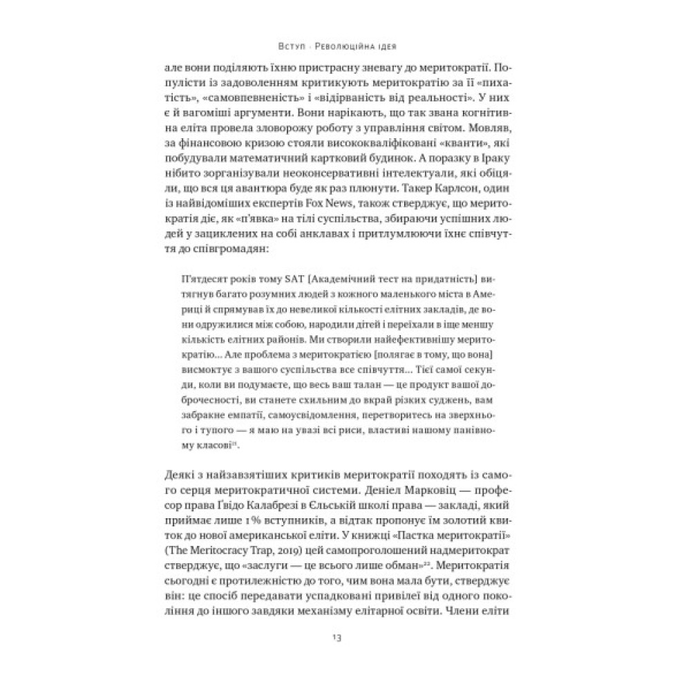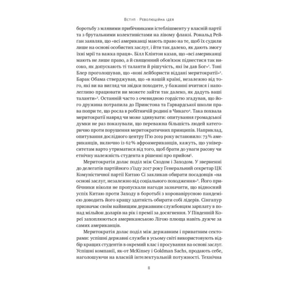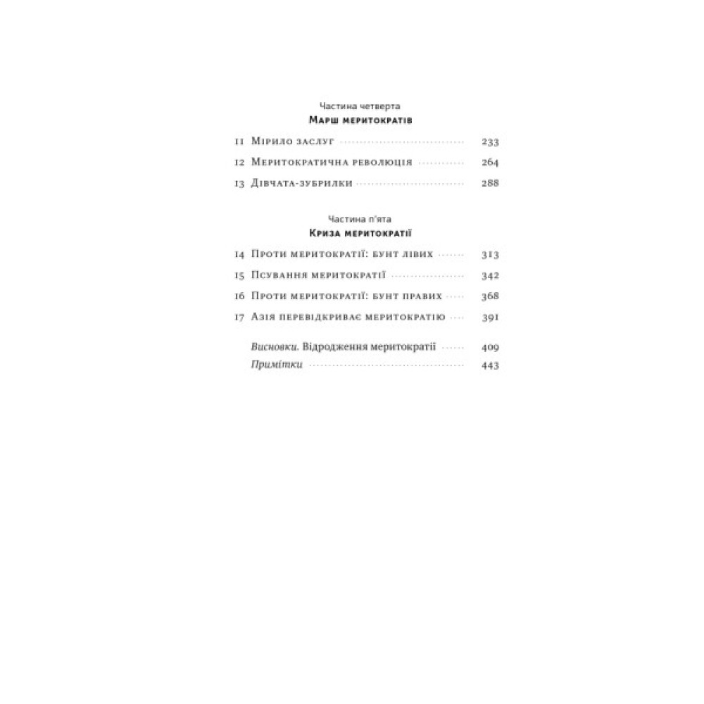 Автор простежує історію меритократії від часів винайдення в Стародавні часи і до її сьогоднішньої кризи, щоб врешті поставити ключові питання — яке в неї майбутнє і чи є їй адекватні альтернативи?
