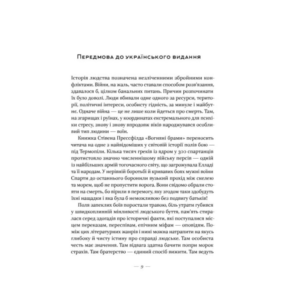 Дружина з трьохсот спартанців на чолі з царем Леонідом та кількатисячне військо союзників вирушили до Термопільського проходу, щоб бодай на якийсь час зупинити мільйонне військо перського царя. Усі вони знали, що йдуть на неминучу смерть. Битва під Термопілами – один із найвідоміших прикладів хоробрості, а «Вогняні брами» – один із найкращих мілітарних романів не лише про цей історичний епізод, але й про війну загалом. Про війну як вона є. Криваву, брутальну, нещадну і брудну війну, в якій дивом залишається місце для людськості, а те, що ми бачимо як героїзм, перефразовуючи слова одного з персонажів роману, – лише робота, яку треба зробити добре.