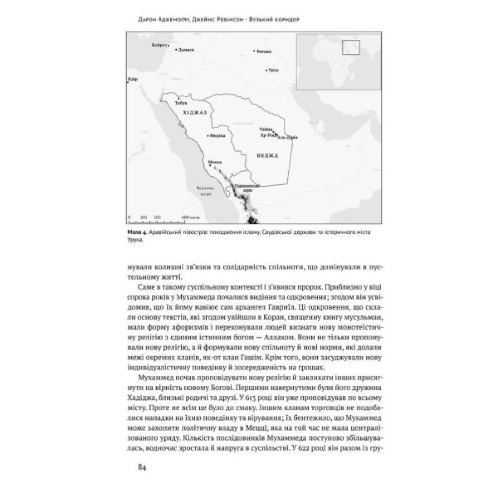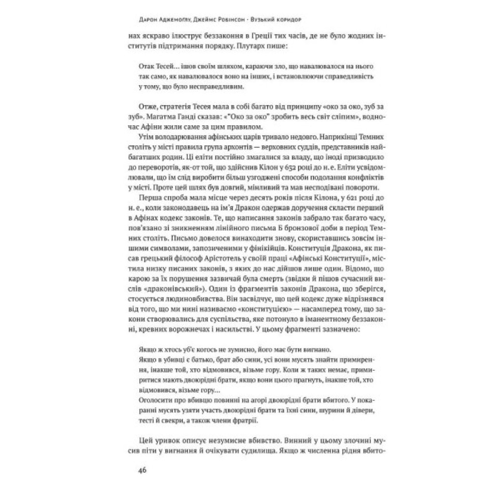 Свобода в історії людства завжди була рідкістю. Між гнітом деспотичної держави й насильством від бездержав’я пролягає вузький коридор до свободи. На думку Дарона Аджемоґлу і Джеймса Робінсона, саме в ньому держава й суспільство мають врівноважувати одне одного. Як стримувати державу, що має величезний бюрократичний апарат і потужне військо? Як підтримувати в суспільстві співпрацю й захистити його від маніпуляцій поділами і відмінностями?