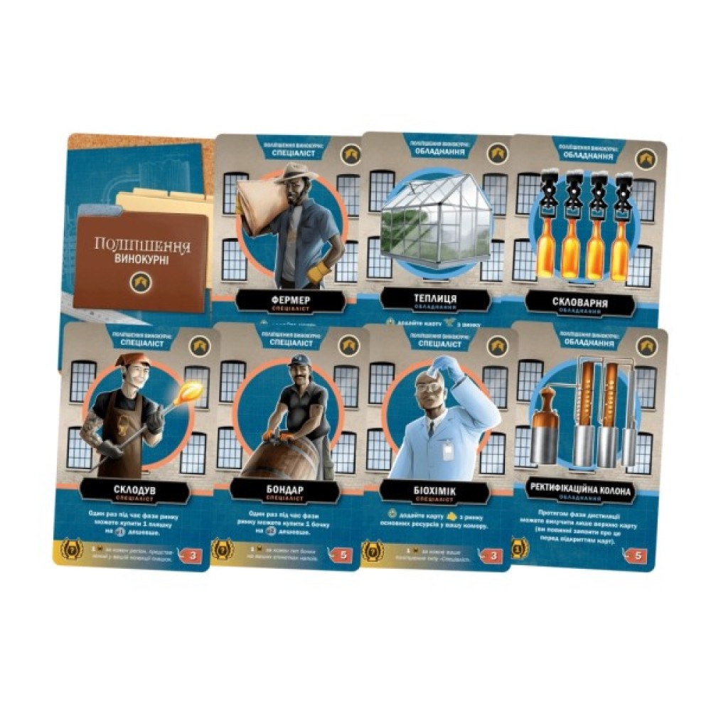 Комплектація 333 карти (56x87 мм), 187 картонних жетонів, 68 мінікарт (41x63 мм), 43 дерев’яні кубики й фішки, 20 великих карт переліків рецептів, 5 планшетів винокурень, 5 двошарових планшетів рецептів, 5 великих карт-пам’яток гравця, 3 ігрові планшети, 2 книжки правил