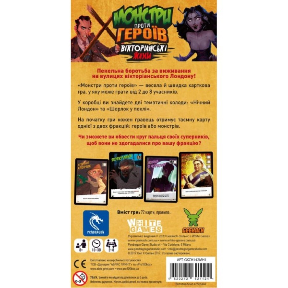 Настільна гра Geekach Games "Монстри проти героїв. Вікторіанські жахи" – це виняткова карткова стратегія, яка затягує вас у світ містичної Англії з її загадковими вуличками та потойбічними створіннями. Розроблений для підлітків та компанії, цей захоплюючий шедевр дозволяє відчути себе частиною інтриг і стратегічних протистоянь, де кожен ваш вибір може стати вирішальним.