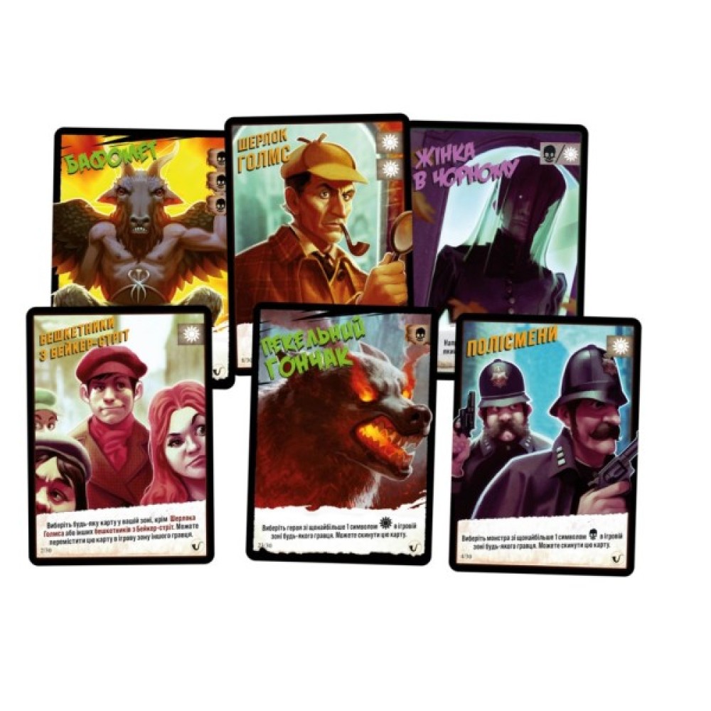 Основу гри складають дві тематичні колоди: «Нічний Лондон» та «Шерлок у пеклі», кожна з яких включає 36 карт. Обирайте між фракціями героїв і монстрів, використовуючи свої здібності до блефу та дедукції, щоб набути переваги над своїми конкурентами. Насолоджуйтесь унікальним ігровим процесом, де кожен хід відкриває нові можливості для реалізації вашого стратегічного плану.