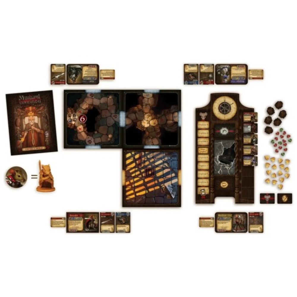 Комплектація гри вражає — вас очікують 6 фігурок мишок та 16 фігурок поплічників, планшет пригод, 8 двосторонніх плиток локацій, 28 карт умінь та 71 карта обшуку, які гарантують кожній партії несподіваний розвиток. Завдяки високоякісним матеріалам, з яких виконані всі елементи, ви отримаєте справжнє задоволення від гри.