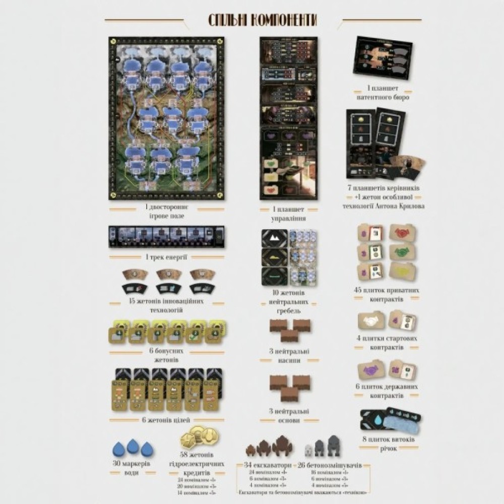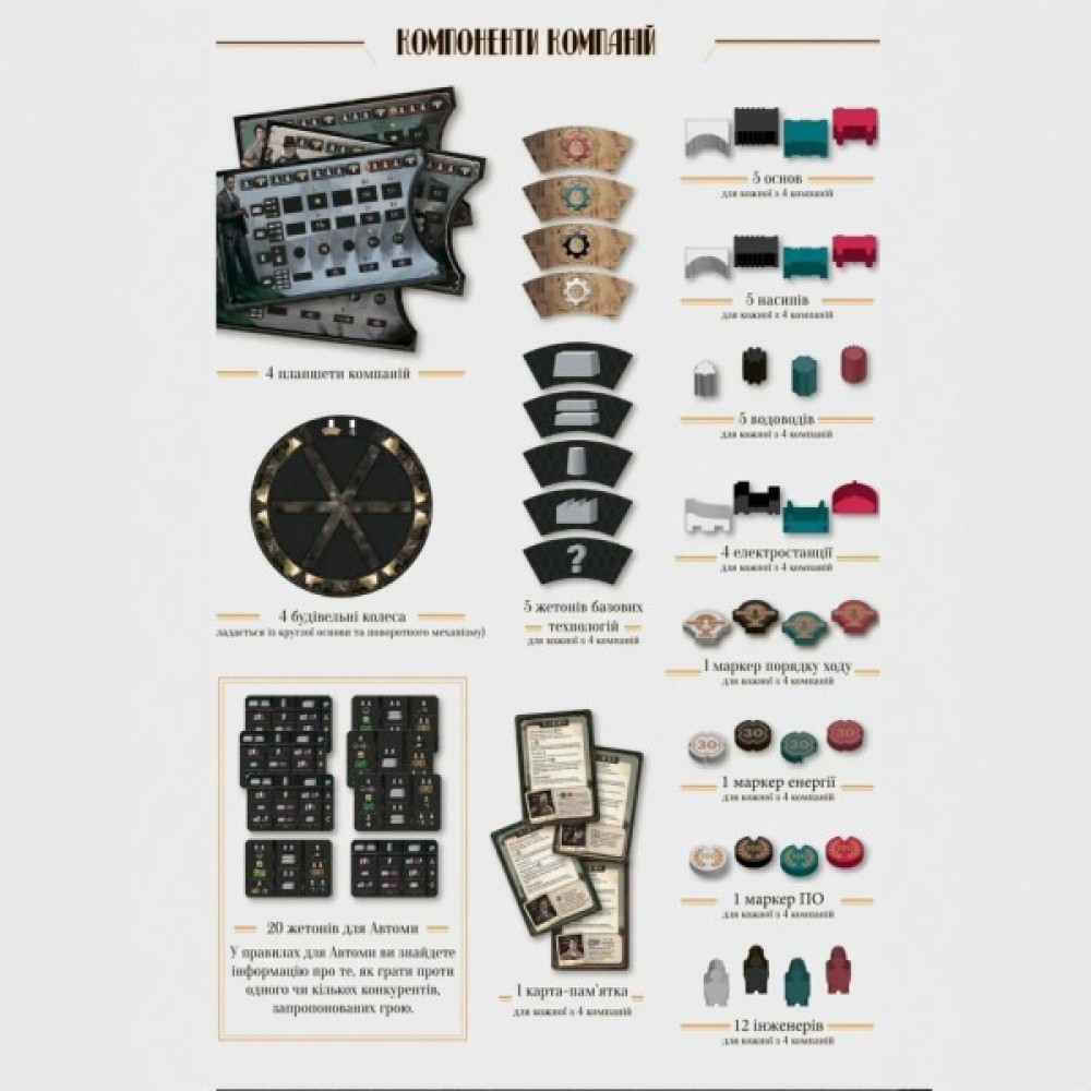 Ця гра, розроблена для компанії від 1 до 4 гравців віком від 13 років, забезпечує глибокий інтерактивний досвід завдяки високоякісним компонентам і детальним інструкціям українською мовою. Натхненна генієм Ніколи Тесли, гра дозволяє вам не лише спостерігати за розвитком технологій, але й активно брати в них участь. Ви будете керувати водними потоками, відкривати шлюзи та впроваджувати новітні технології, щоб обійти конкурентів.