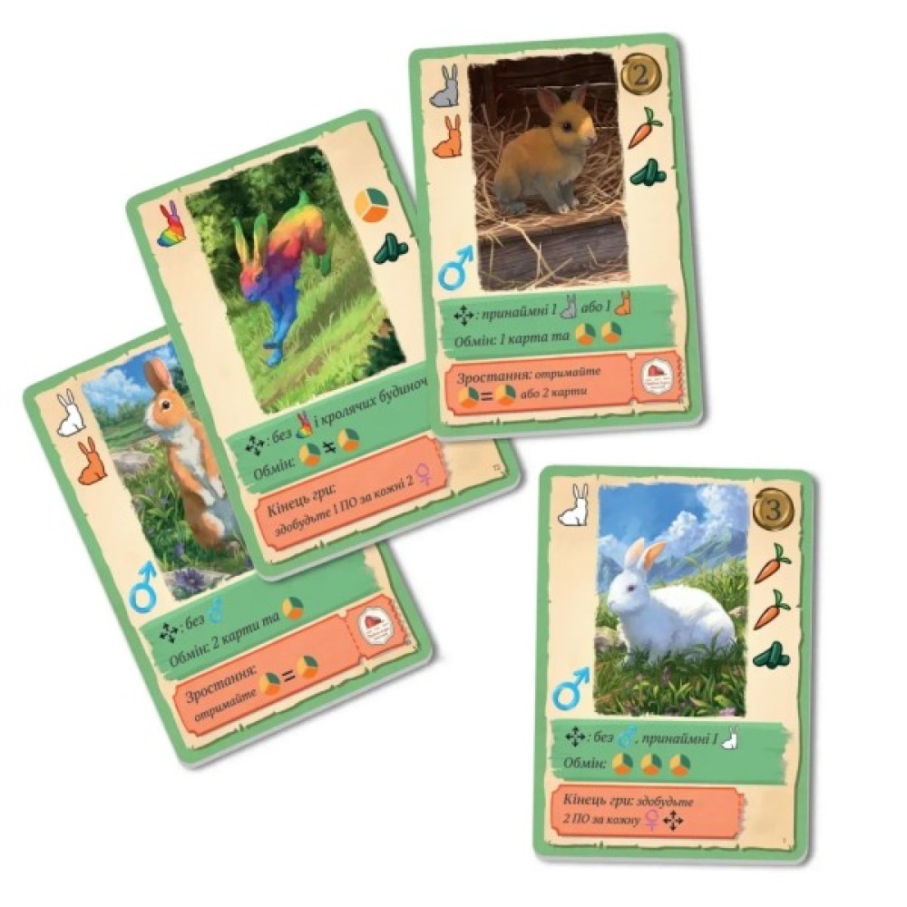 Комплектація 72 унікальні карти кроликів (18 самців, 48 самок і 6 диких); 4 карти-пам'ятки; 1 жетон першого гравця; 72 жетони ресурсів (24 сіна, 24 моркви та 24 пелети); 1 книга правил