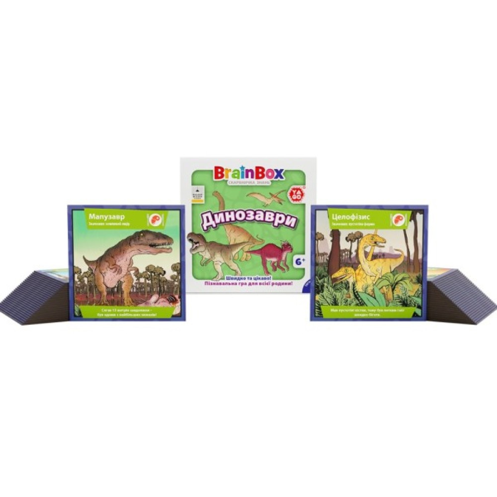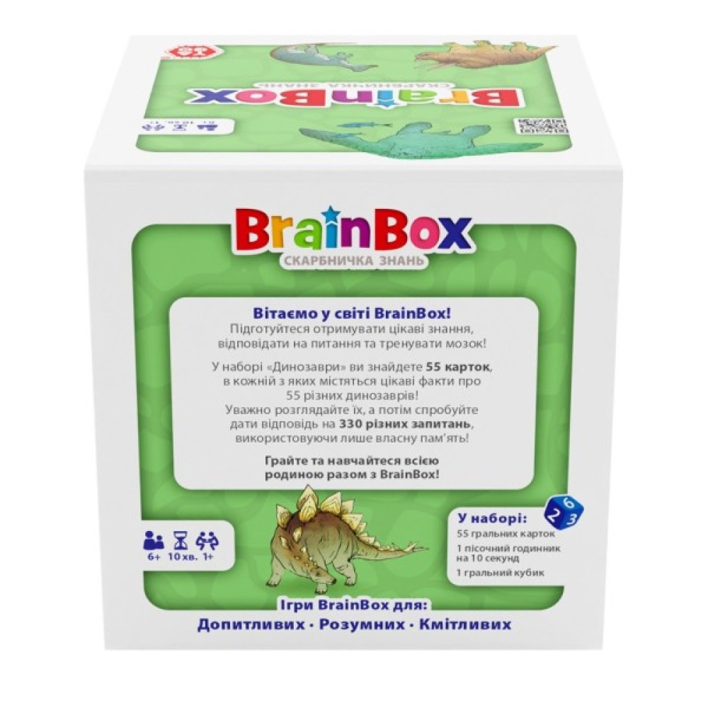 У комплект входять 55 ігрових карток з барвистими ілюстраціями та унікальними фактами про динозаврів, які роблять навчання цікавим і інтерактивним процесом. За допомогою пісочного годинника на 10 секунд і грального кубика гравці відповідають на одне з 330 запитань, тренуючи пам'ять та спостережливість.