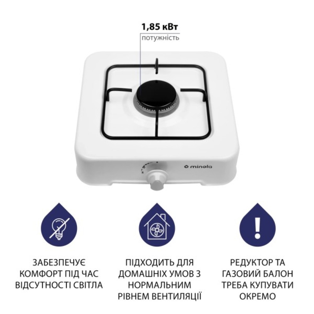 У газовій плиті Minola TGH 100 гармонійно поєднуються простота та практичність. Модель поставляється без балона із газом. Вона обладнана однією конфоркою діаметром 6.5 см та потужністю 1.85 кВт. Ширина плити складає всього 30 см, що дозволяє легко розташувати її практично на будь-якій горизонтальній поверхні.