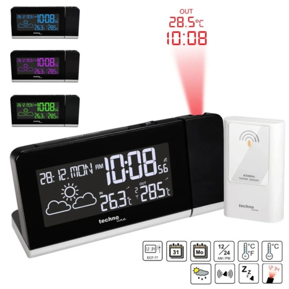 Для тих кому важливий не лише широкий функціонал приладу, але й максимальна чіткість проекції та відмінний зовнішній вигляд - варто зупинити увагу на годиннику Technoline WT539. Спеціальне коліщатко фокусування дозволяє досягнути ідеальної чіткості всіх символів проекції на відстані від 0.5 до 4 метрів. В стильному корпусі поєднані настільний годинник з двома будильниками та домашня погодна станція з виносним температурним датчиком і прогнозом погоди І при цьому час і температура проектується на стелю або стіну, що дуже зручно в темний час доби. Функціонал приладу можна розширити, оскільки він має можливість прийому зовнішньої температури від 3 виносних датчиків (один в комплекті, інші можна придбати окремо). Колір підсвічування дисплея можна обрати з одного з 256-ти кольорів, або налаштувати плавну зміну кольору.