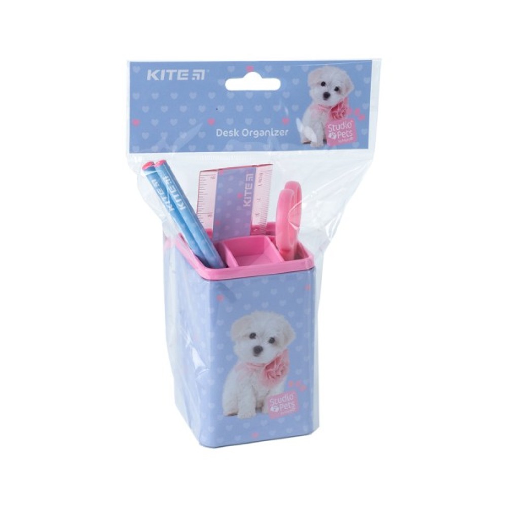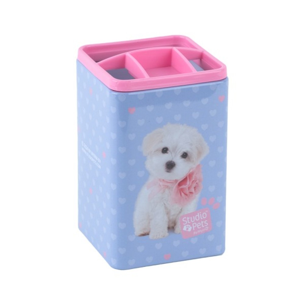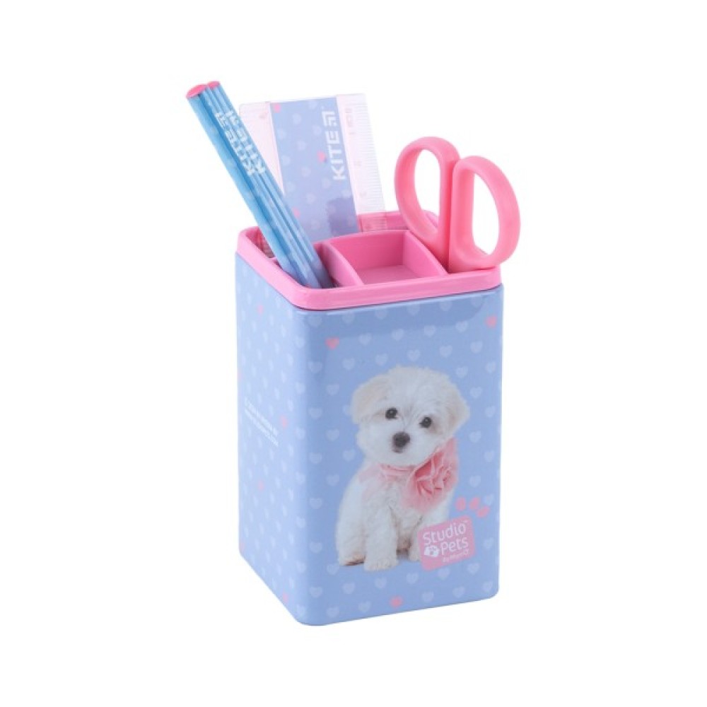 Міцний металевий стаканчик квадратної форми складається з 3-х відсіків з пластиковою окантовкою. Всі складові об'єднує яскравий дизайн в крутій ліцензії Studio Pets.