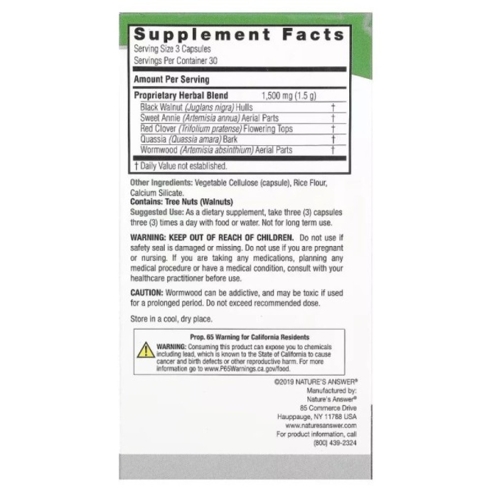 Чорний горіх вважають унікальною рослиною, оскільки, крім його складу з величезної кількості мікроелементів, він становить сильну конкуренцію всім цитрусовим за вмістом вітаміну С, а вміст йоду в даній рослині перевищує в кілька разів усіма відому морську капусту. Однією з найактивніших речовин у складі чорного горіха є юглон, який містить цілий комплекс корисних та поживних речовин, використовується як природний антибіотик, який перешкоджає розвитку бактерій, очищенню організму від токсинів та паразитів, покращує роботу ШКТ, добре допомагає при запорах та діареї, стабілізуючи роботу кишківника. Маючи такі потужні властивості, даний препарат чудово очищає нашу кров і весь організм в цілому від шлаків та багато іншого, що позитивно впливає на уповільнення старіння та покращення загального самопочуття. Речовина такого типу має цілий спектр фізичних властивостей. Препарат відмінно зарекомендував себе не тільки як профілактичний засіб, але і так само як прекрасний лікувальний препарат. Корінні жителі Америки, що відкрили цю рослину, застосовували її як відвар для підвищення продуктивності. На даний момент прийом цього препарату не становить особливих труднощів.