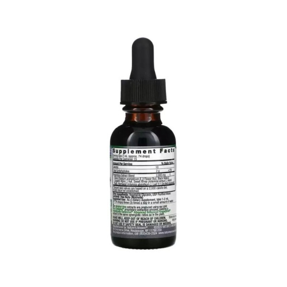 Чорний горіх, уродженець Америки, доводиться нашому знайомому волоському горіху родичем. Він відомий усім своїм багатим хімічним складом і, відповідно, багатьма корисними властивостями. Поєднання з полином благотворно впливає на мікрофлору кишечника, здоров'я шлунка, печінки. Слід зазначити, що препарат не містить спирт.
