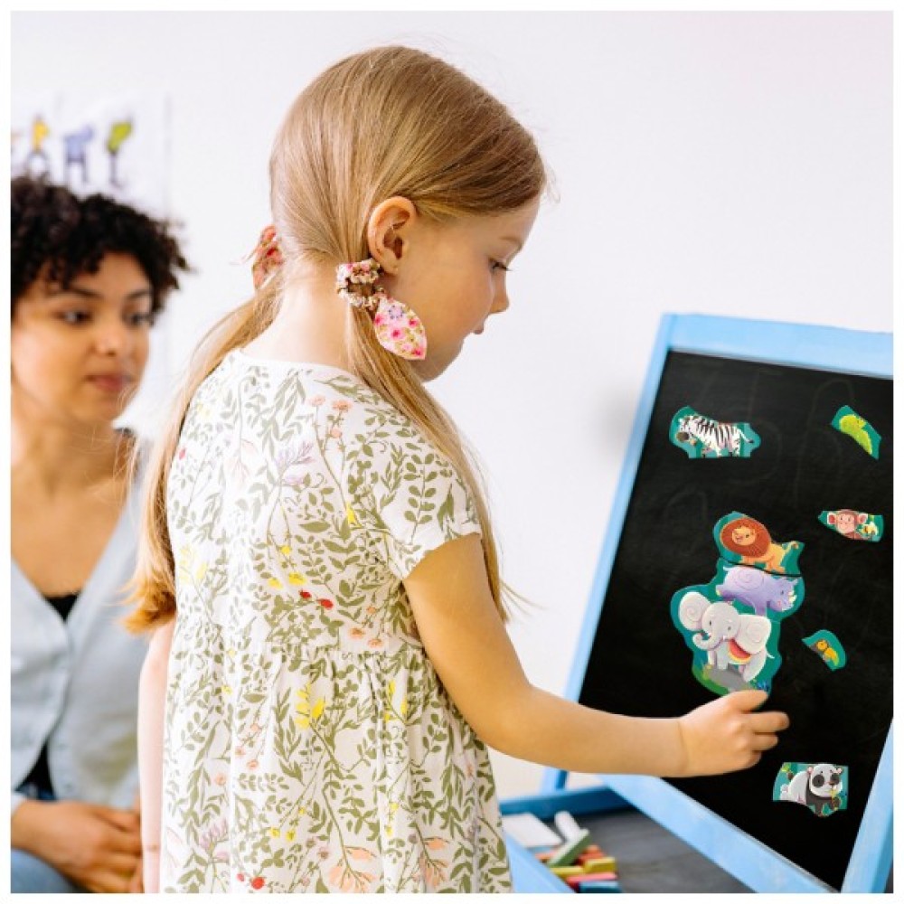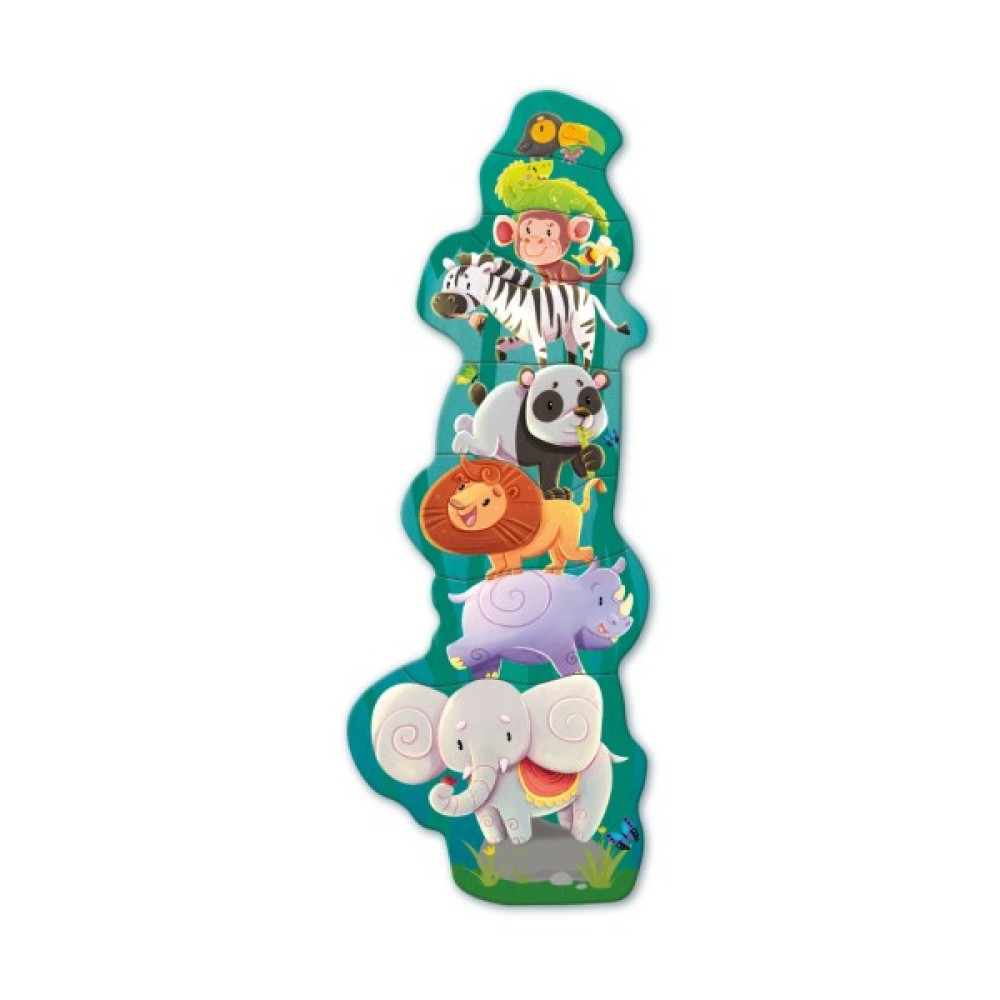 На магнітних елементах зображені слон, носоріг, лев, панда, зебра, мавпа, крокодил та тукан. Ці милі та яскраві персонажі неодмінно сподобаються вашій дитині. Магніти можна розташовувати один на одному, створюючи веселу башту з тварин. Це заняття сприяє розвитку дрібної моторики, координації та просторового мислення.