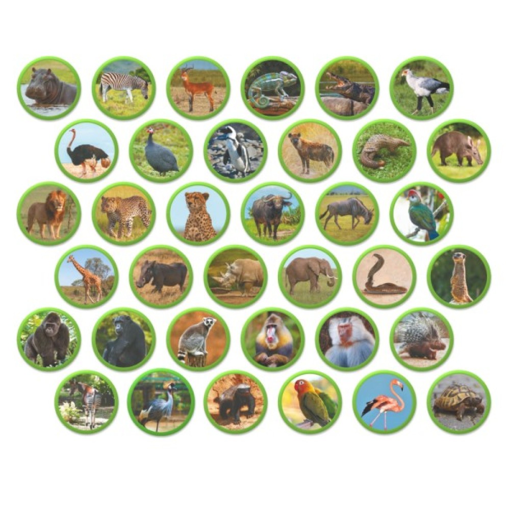 • 36 магнітів із зображеннями реальних тварин Африки: бегемот, фламінго, крокодил, зебра, гієна, фазан, сурикат та багато інших;
