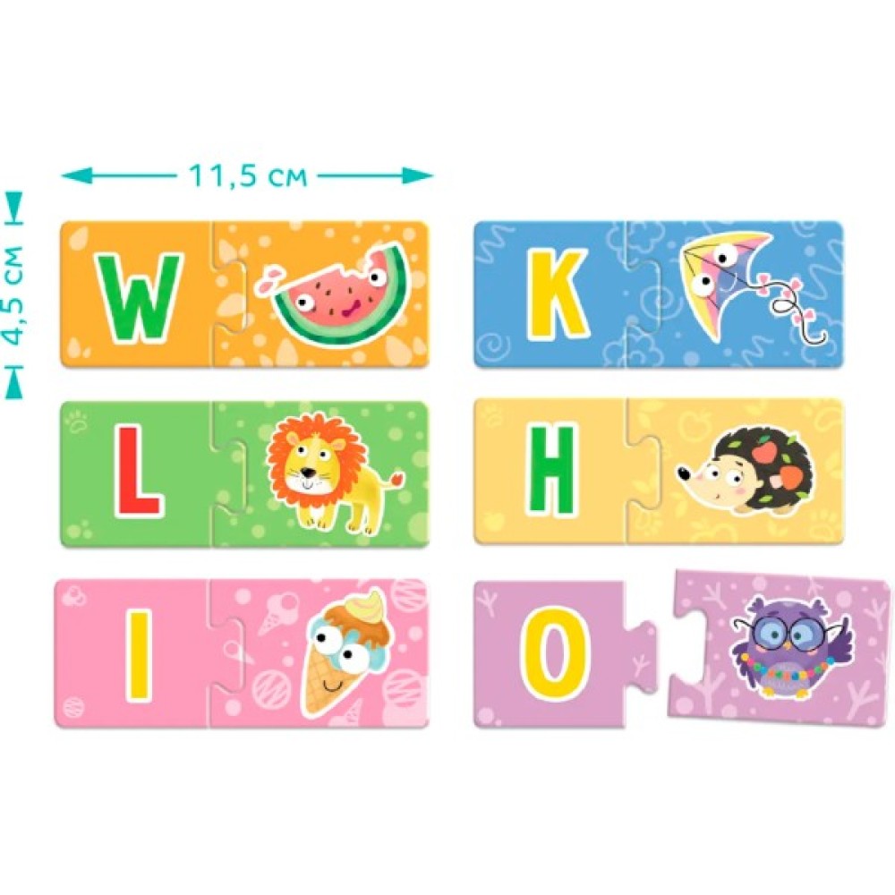 Навчальна гра-пазл DoDo Англійська абетка містить 26 пар пазлів розміром 116 х 46 мм.