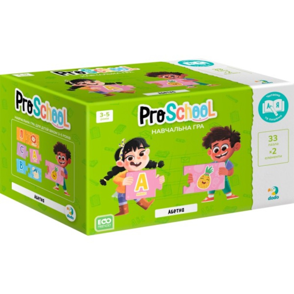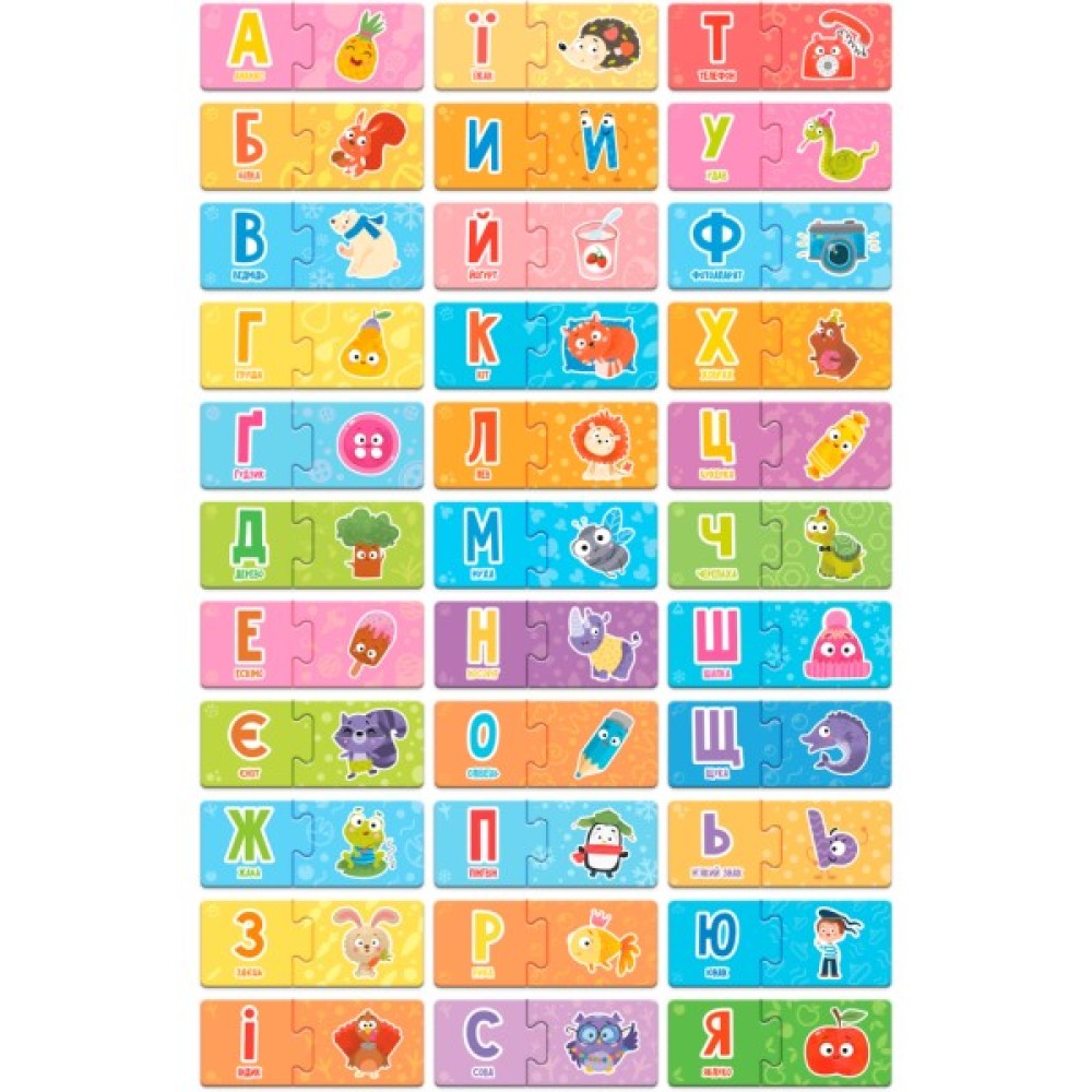 Навчальна гра-пазл DoDo Абетка містить 33 пари пазлів розміром 116 х 46 мм.