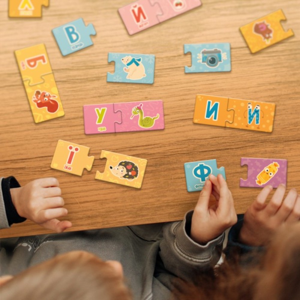 Дітки мають співвіднести дві частинки пазлу одного кольору, одна половинка якого містить літеру, на яку починається слово зображеного на іншій половинці предмета чи тваринки.