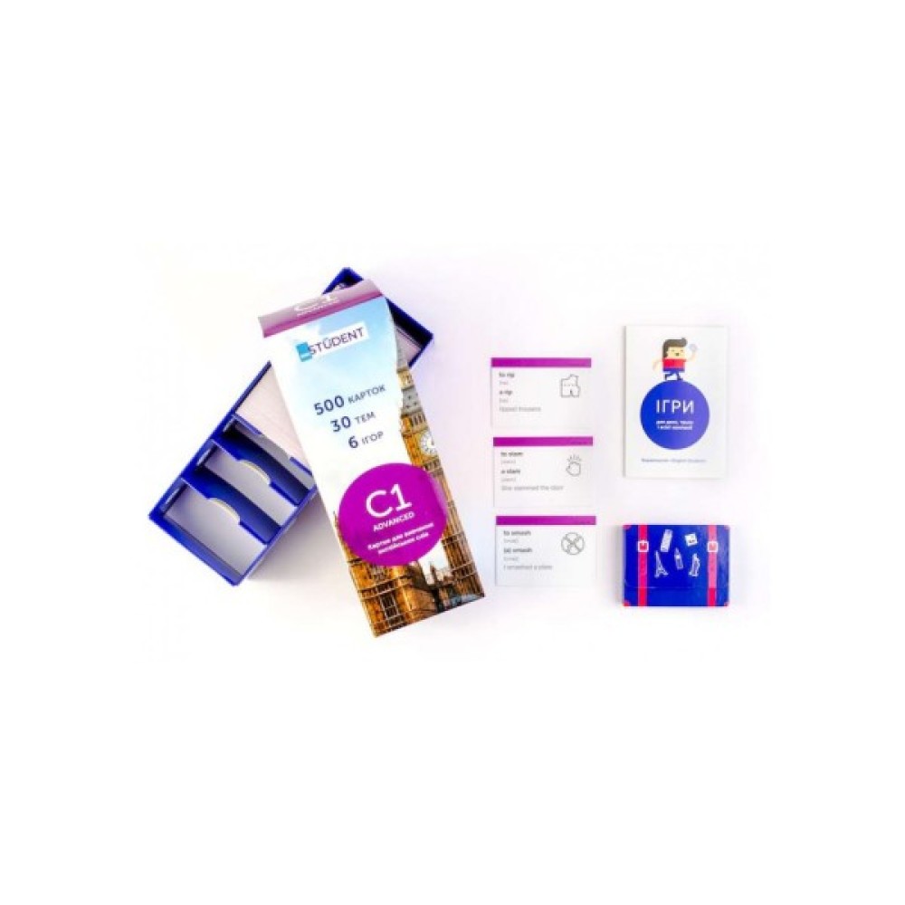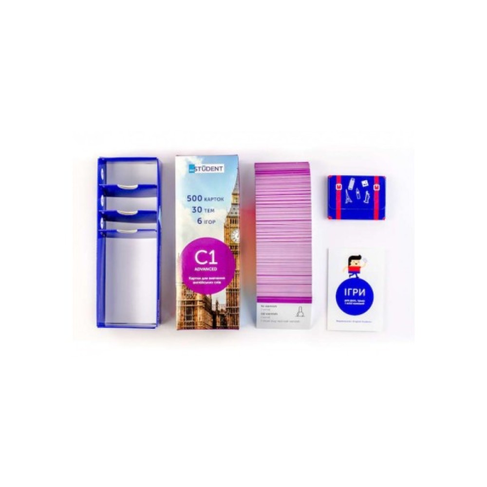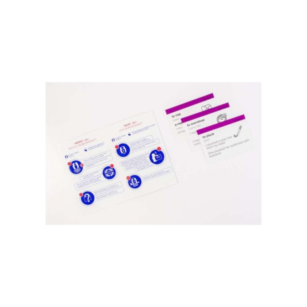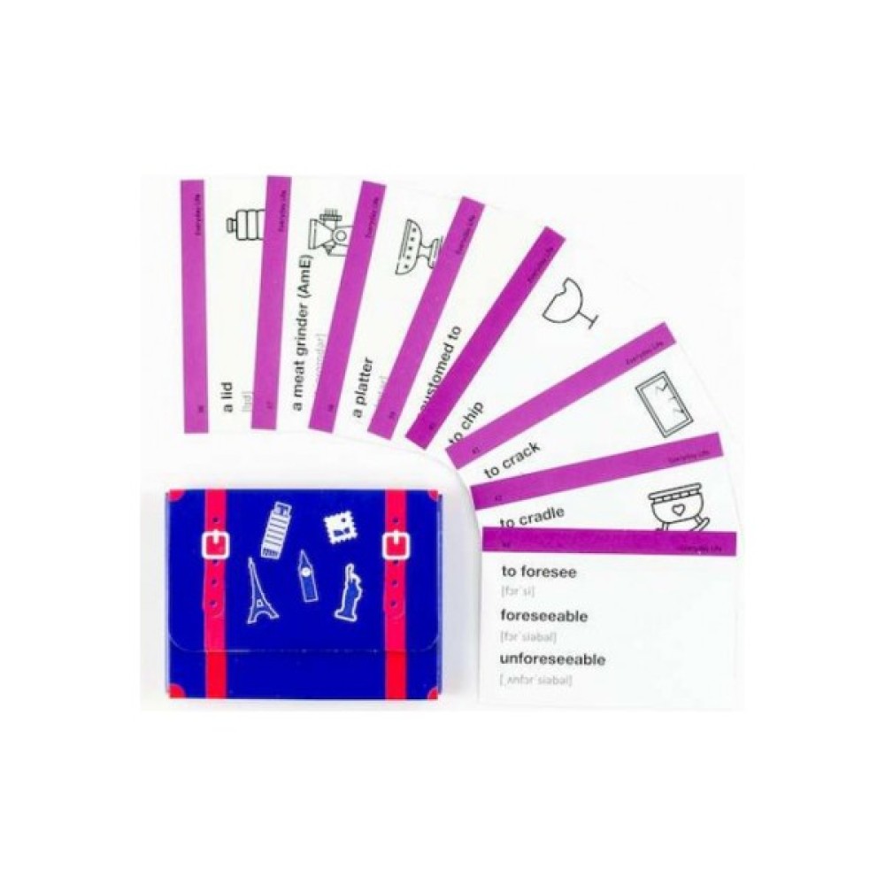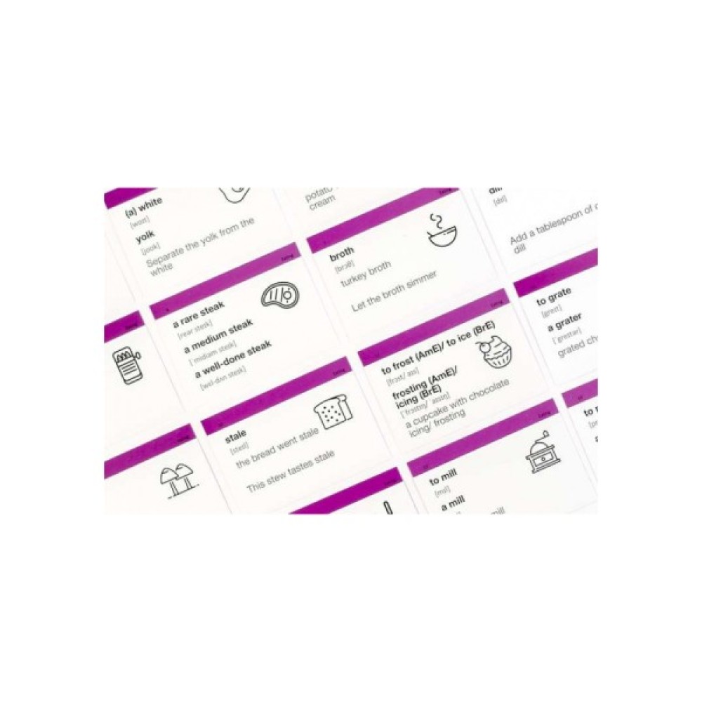 - На зворотному боці картки – український переклад, зазначений номер карти, переклад слова, переклад речення-прикладу, переклад теми, рівень складності .