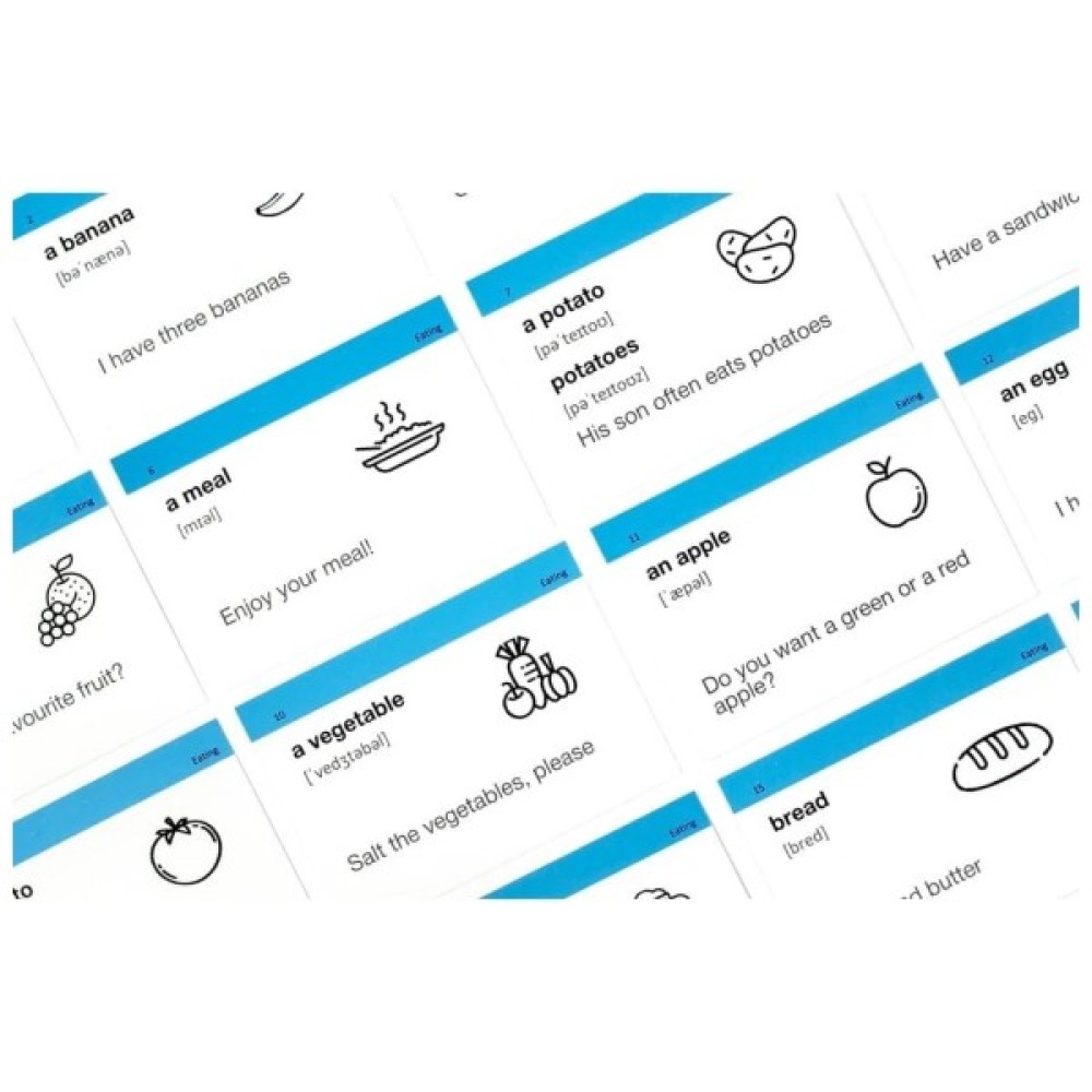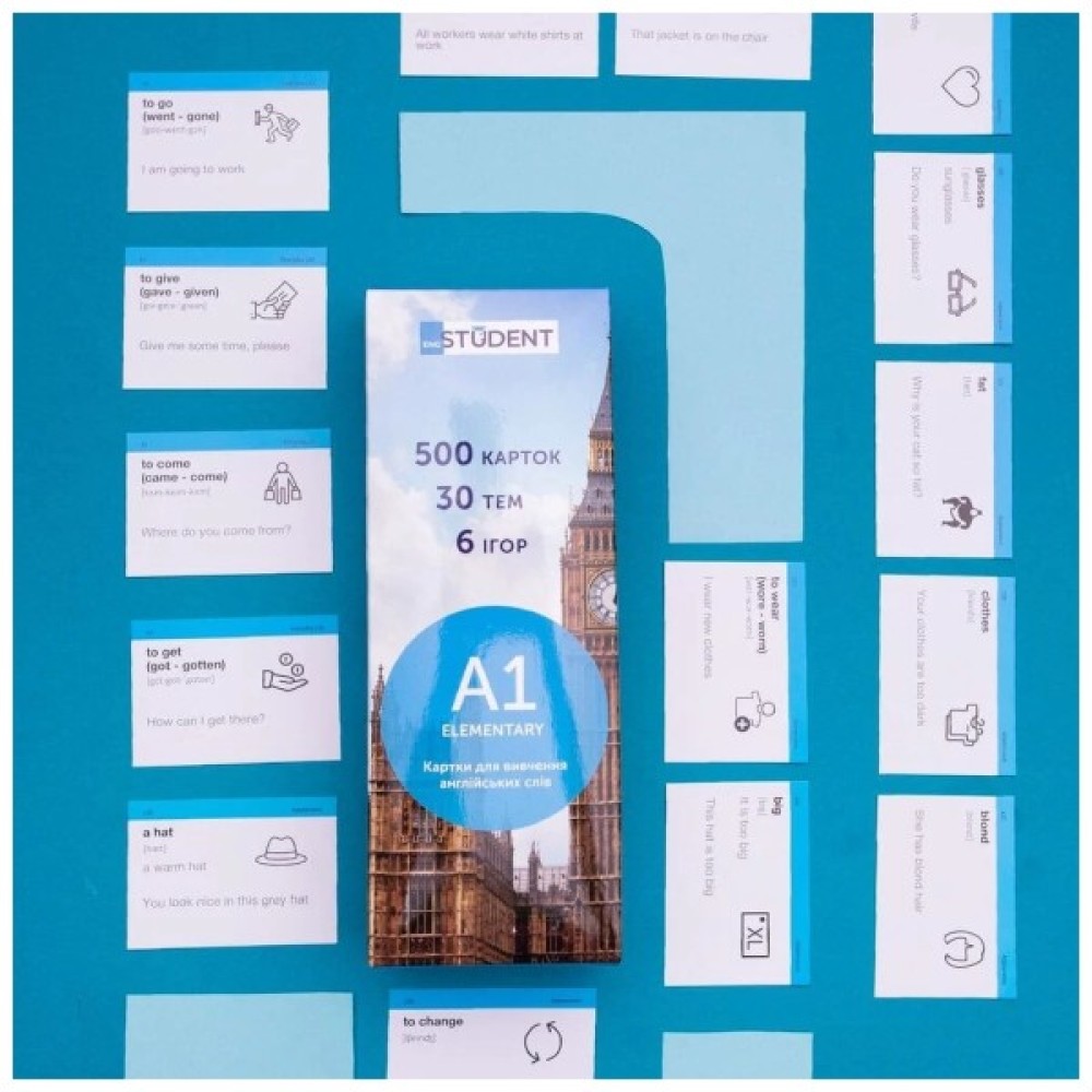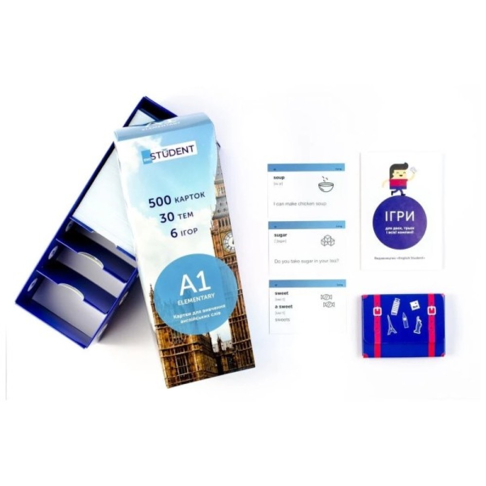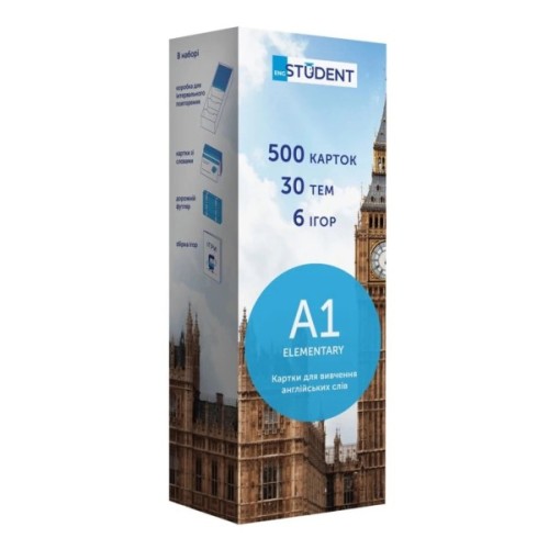 Рівень А1, Elementary — набір карток для початківців. Для тих, хто розпочинає вивчати англійську. Чудовий подарунок та мотивація для дітей, друзів та близьких. В цьому наборі 646 англійських слів та 625 прикладів їх вживання.