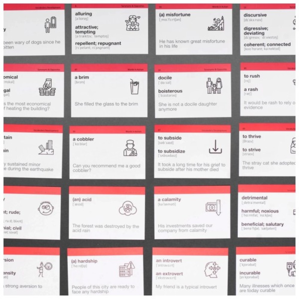 Додаткові функції 500 карток зі словами; коробка для інтервального повторення; дорожній футляр; повний перелік слів; QR-код із посиланням на аудіосупровід; правила ігор