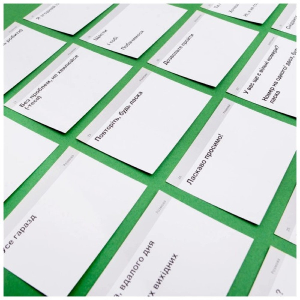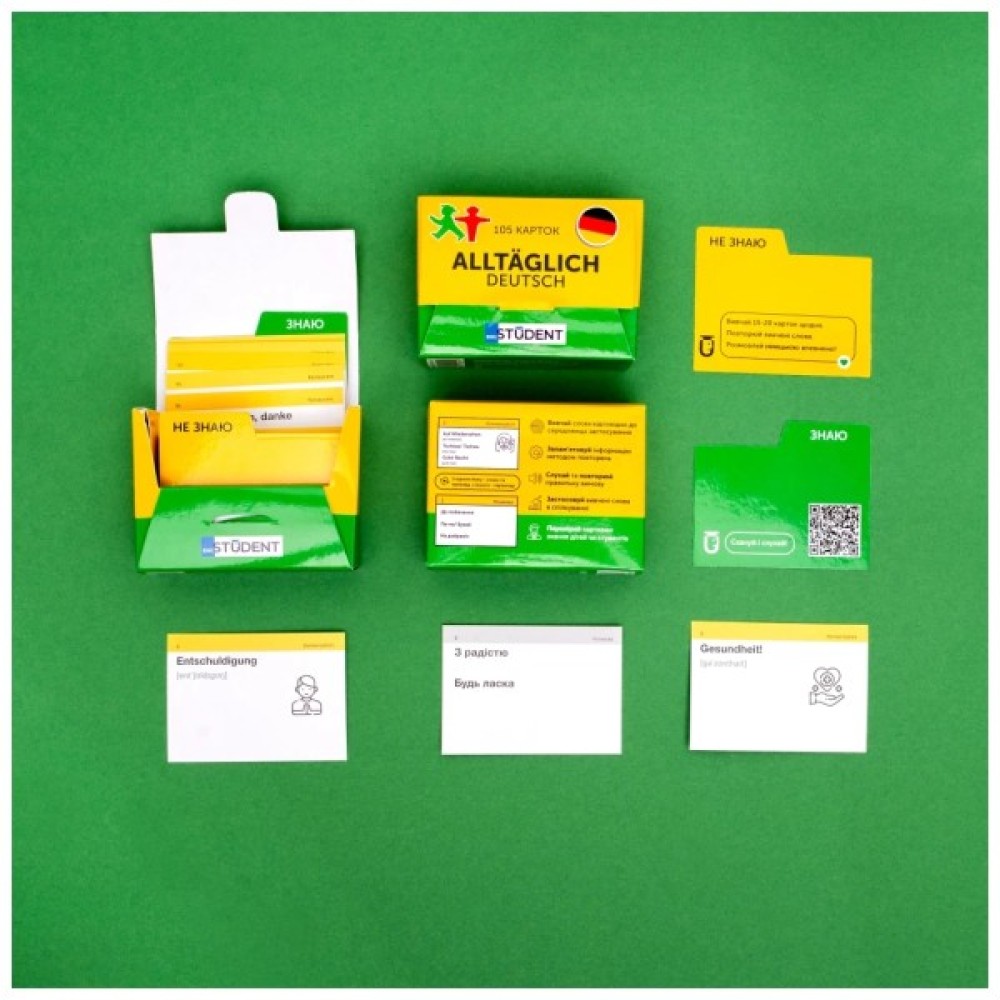Кожен набір містить: 105 карток, два розділювачі (Знаю та Не знаю), спрощену версію коробки для інтервального повторення.