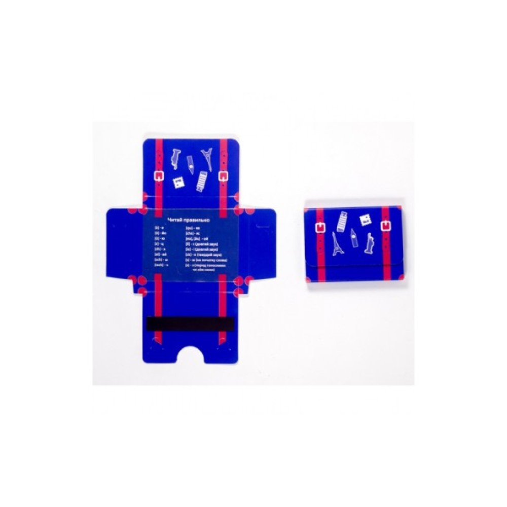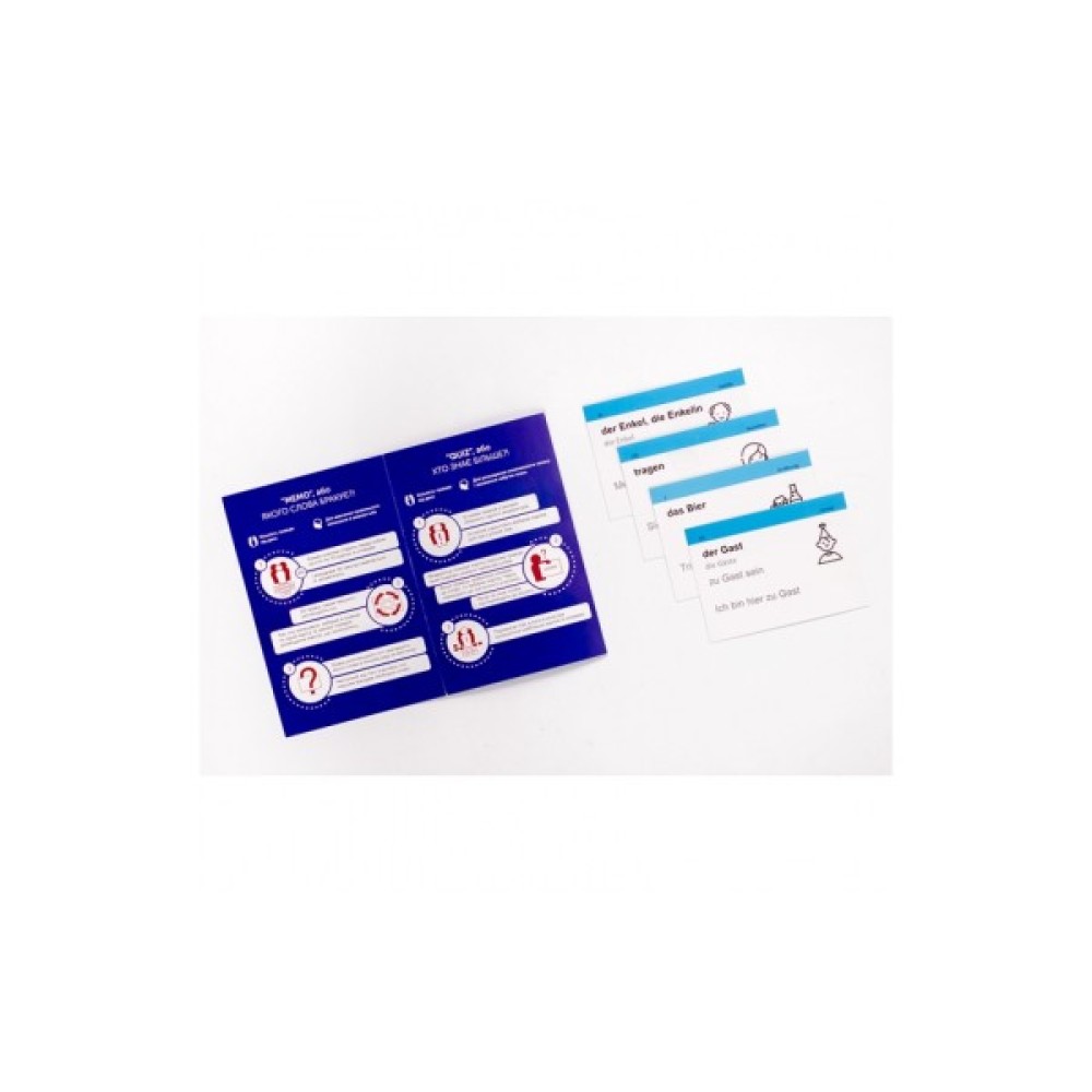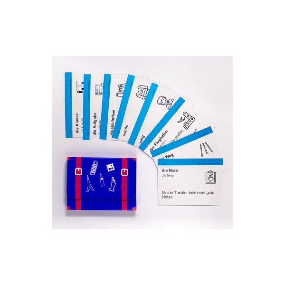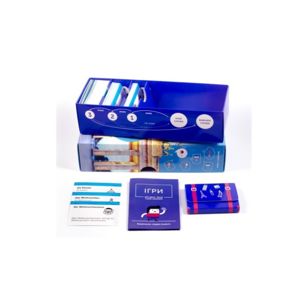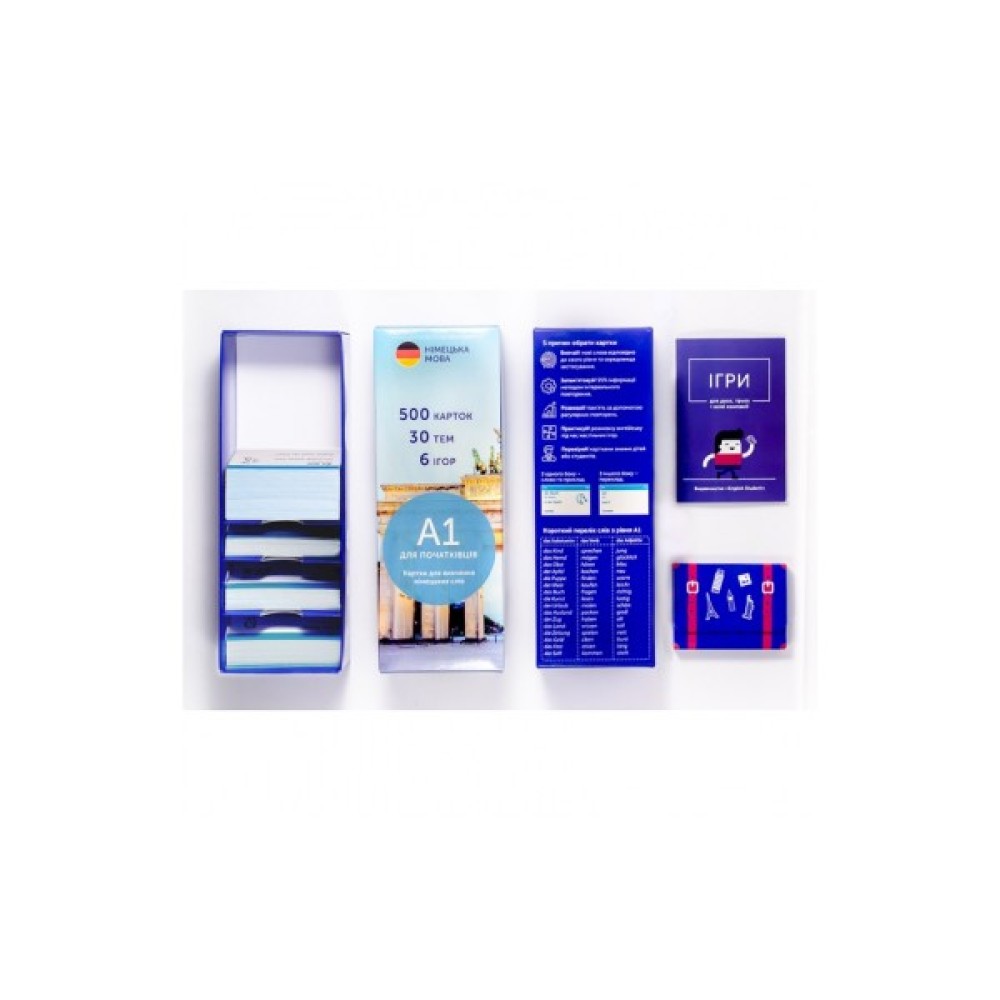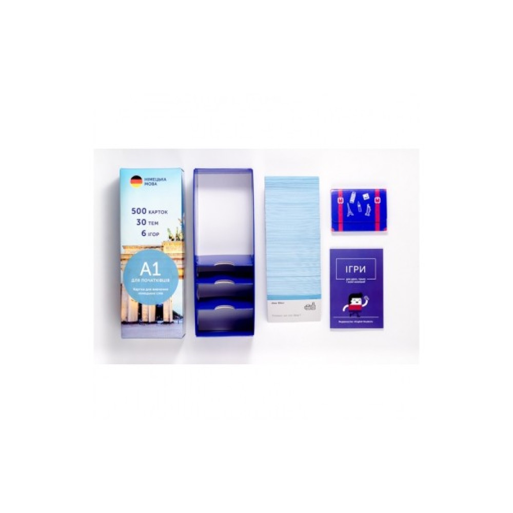 Набір карток для вивчення німецької містить: 500 карток, коробку для інтервального повторення, дорожній футляр та збірку ігор.