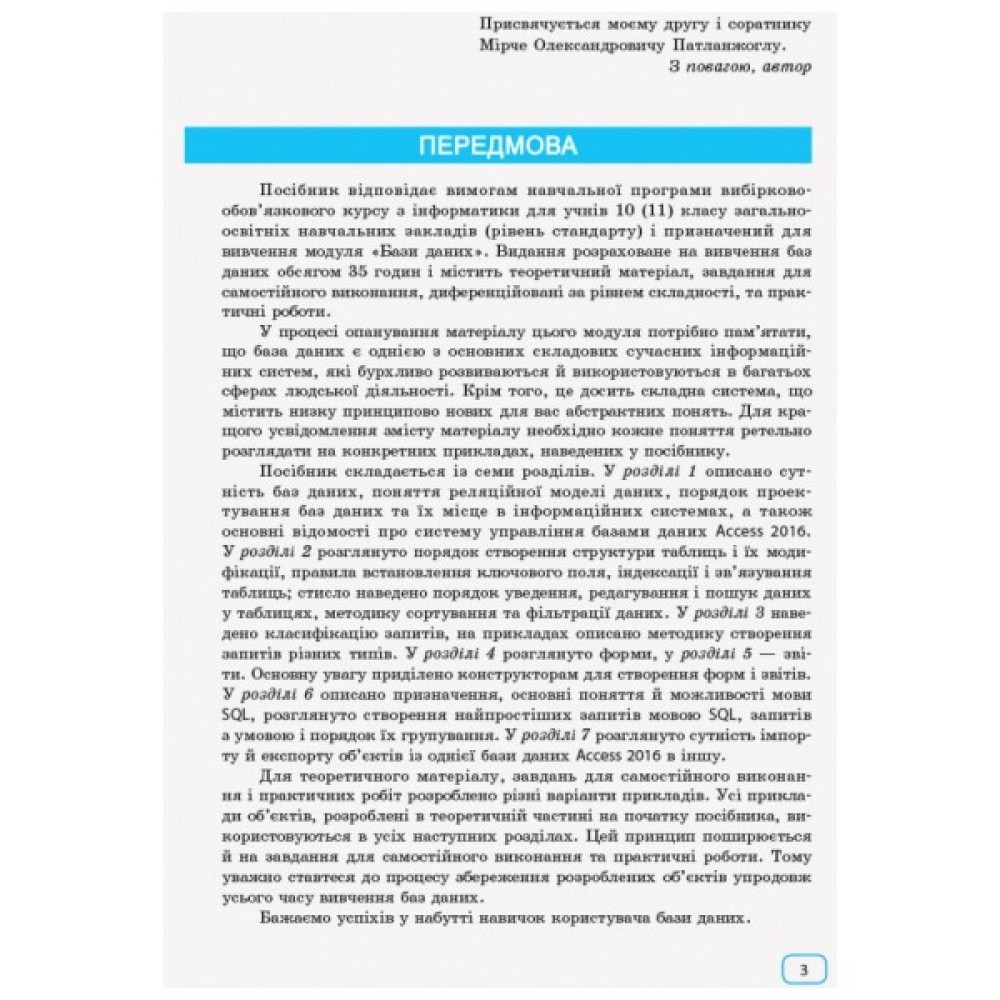 Зміст посібника відповідає вимогам навчальної програми вибірковообов’язкового курсу з інформатики для учнів 10 (11) класу загальноосвітніх навчальних закладів (рівень стандарту) і призначений для вивчення вибіркового модуля «Бази даних».